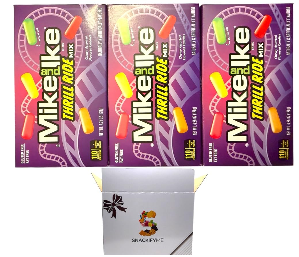 SNACKIFYME Gift Box Of Mike and Ike Limited edition thrill ride mix Chewy Candy – Theater Box 3 Pack 4.25 oz (120g) – Gluten-Free, Fat-Free – Perfect