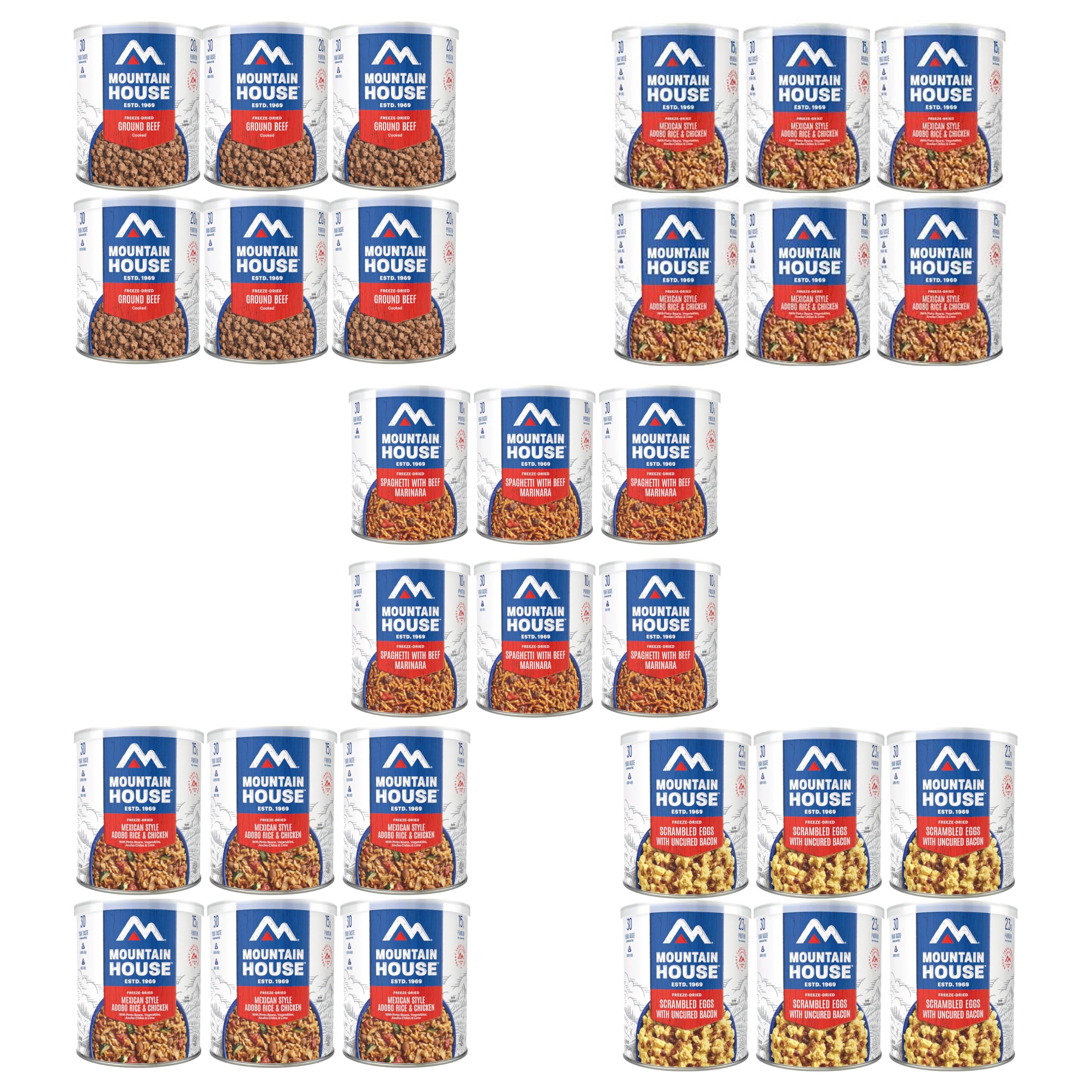 COMPLETE EMERGENCY MEAL KIT:- Includes 5 full cases of best-selling Mountain House freeze-dried meals: Ground Beef, Spaghetti with Meat Sauce, Scrambled Eggs with Bacon, Adobo Chicken with Rice, and Chili Mac with Beef. #10 CANS FOR LONG TERM STORAGE:- Each case contains large, shelf-stable #10 cans
