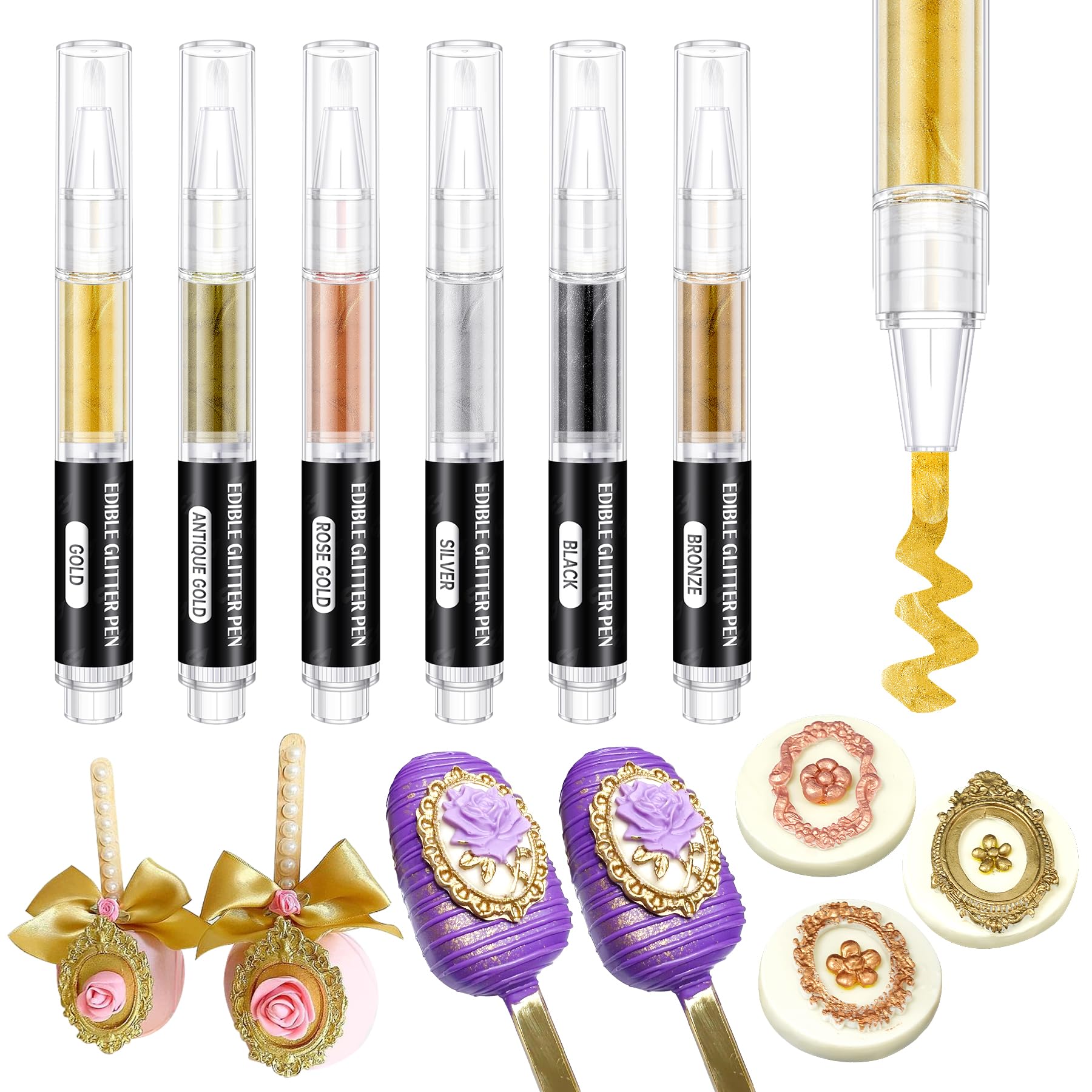 Metallic Edible Paint Pens 6 Colors โ Food Coloring Markers in Gold, Silver, Bronze & More โ Shiny Glitter Edible Pens for Cookie, Fondant, Icing &