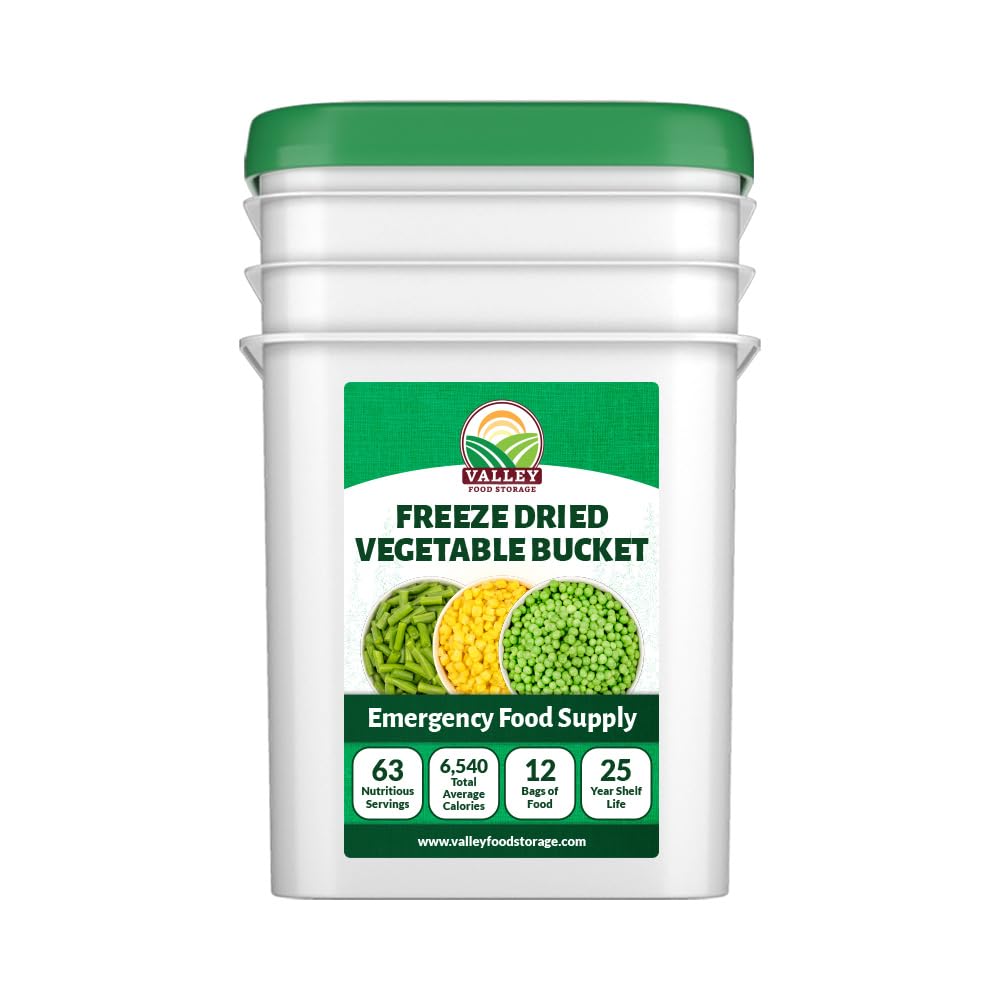 Valley Food Storage Freeze Dried Vegetable Bucket | 12 Pouches, Mixed Vegetables | Premium Emergency Food Supply, 25 Year Shelf Life | Survival Food