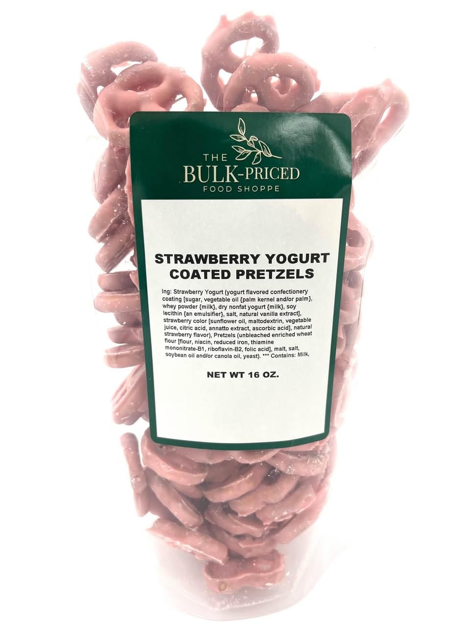 STRAWBERRY YOGURT PRETZELS: The Bulk-Priced Food Shoppe’s strawberry yogurt pretzels are an irresistible snack or dessert treat. If you love pretzels and strawberries, then you’re going to love these! So unique you need to try them. TASTE: These creamy, sweet strawberry yogurt covered pretzels h