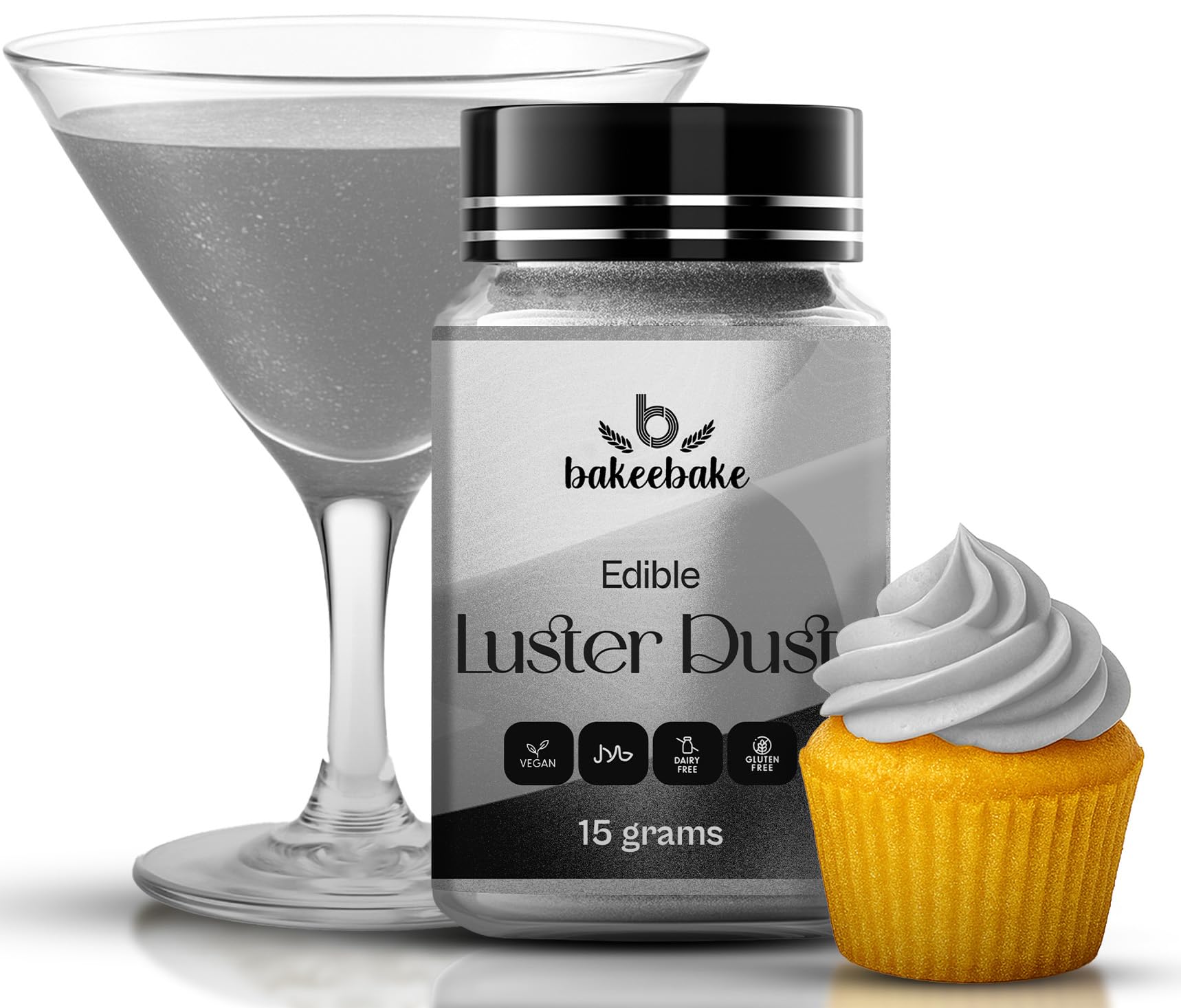 Bakeebake Silver Luster Dust Edible 15g - Edible Glitter for Drinks & Desserts - Gluten Free Edible Silver Dust for Cake Decorating โ Tasteless Vegan