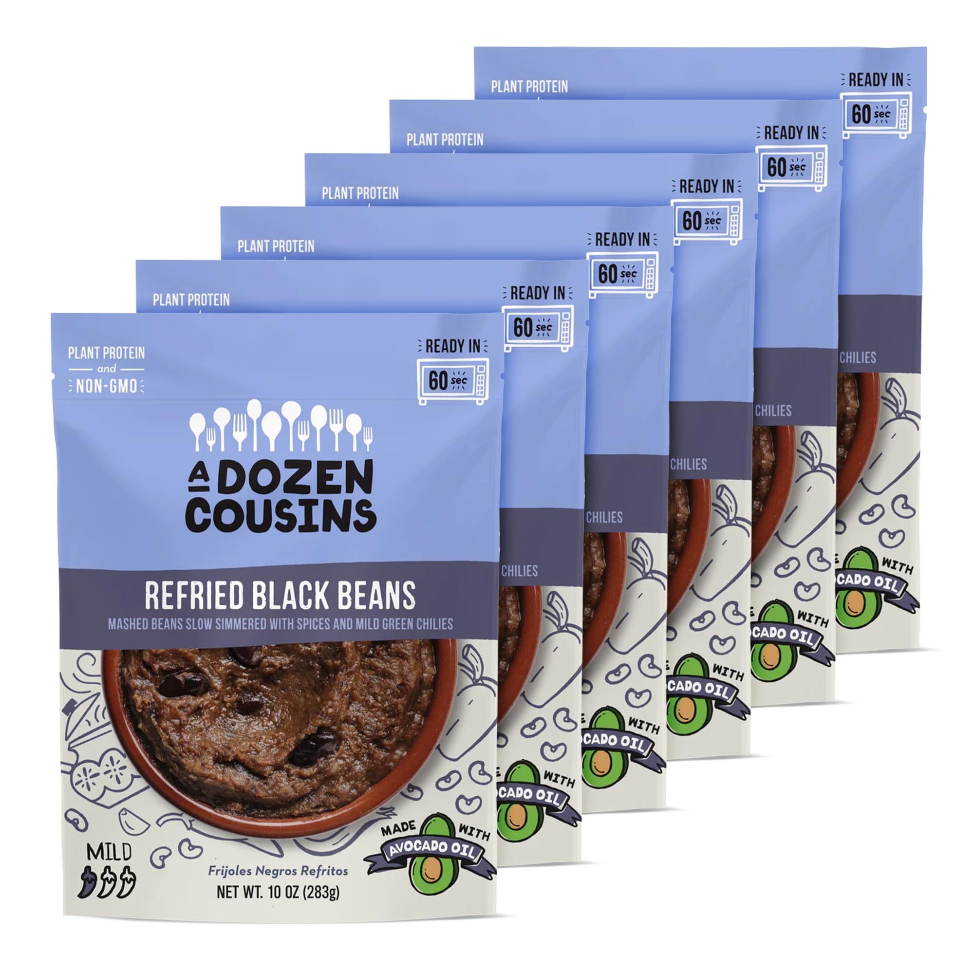 A Dozen Cousins Black Refried Beans (6-Pack) Prepared Food Pouch, Ready to Eat Meal in Seasoned Avocado Oil, Premade Microwave Meal, Instant Refried
