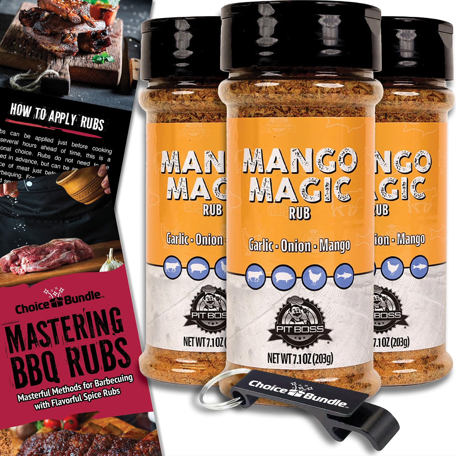 Pit Boss Mango Magic Premium BBQ Barbecue Mixed Seasoning Spice & Dry Rub 3 pk Choice Bundle (21.3 oz) + Guide & Keychain Bottle Opener (5 Items)!