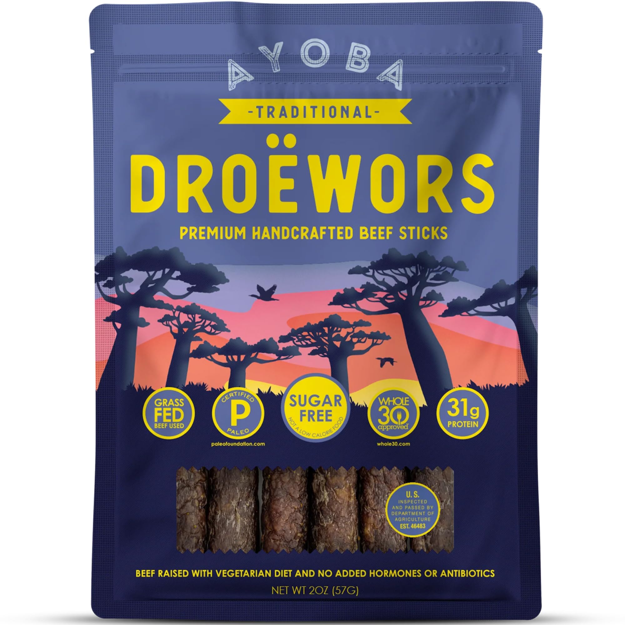 Ayoba Traditional Droewors Grass Fed Beef Paleo Sticks (2 Ounce, Pack of 8) - Keto Friendly, Air-Dried Beef Protein Snacks - Low Carb, Gluten Free,