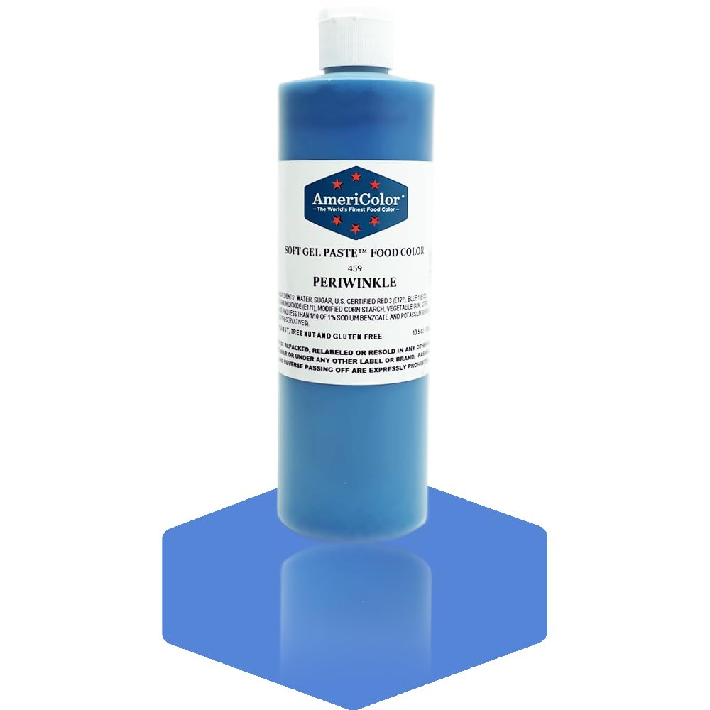 Single 13.5 ounce bottle of Periwinkle Soft Gel Paste food color. Each bottle is formulated with the highest quality ingredients to achieve the most vibrant results with the least amount of product. AmeriColor Soft Gel Paste is the first choice of top decorators worldwide. With more than 50 colors t
