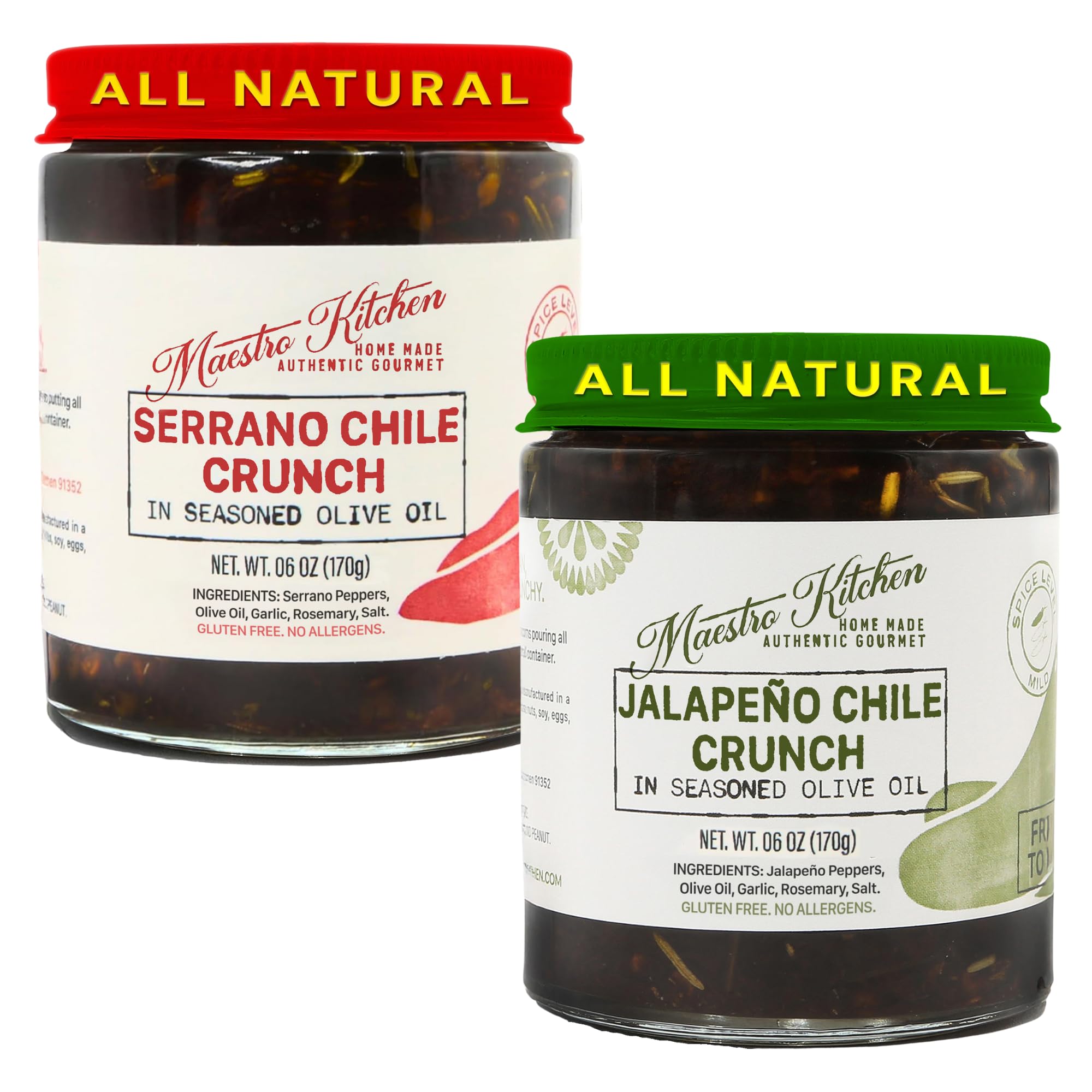 Spicy Serrano & Mild Jalapeno Pepper Chili Crisp Crunch - 6oz Variety 2 Pack - All Natural Chili Oil Hot Sauce 100% Olive Oil, Garlic & Rosemary -