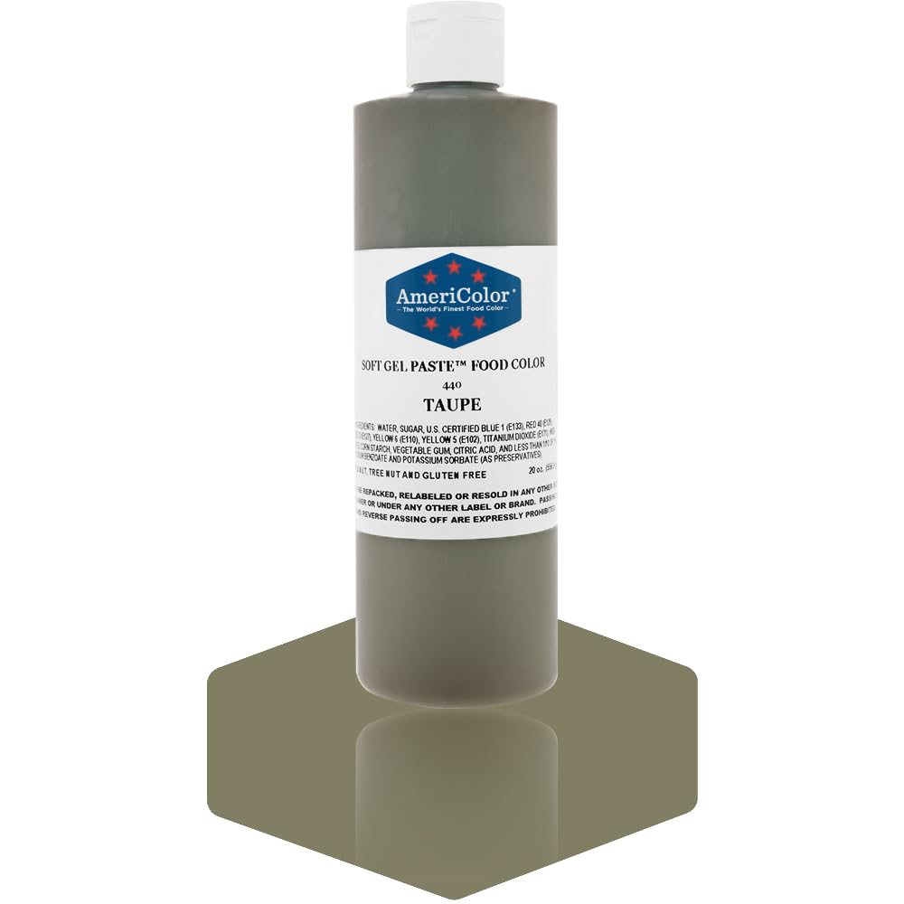 Single 13.5 ounce bottle of Taupe Soft Gel Paste food color. Each bottle is formulated with the highest quality ingredients to achieve the most vibrant results with the least amount of product. AmeriColor Soft Gel Paste is the first choice of top decorators worldwide. With more than 50 colors to cho