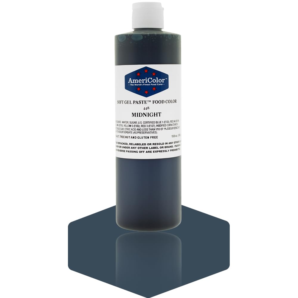 Single 13.5 ounce bottle of Midnight Soft Gel Paste food color. Each bottle is formulated with the highest quality ingredients to achieve the most vibrant results with the least amount of product. AmeriColor Soft Gel Paste is the first choice of top decorators worldwide. With more than 50 colors to