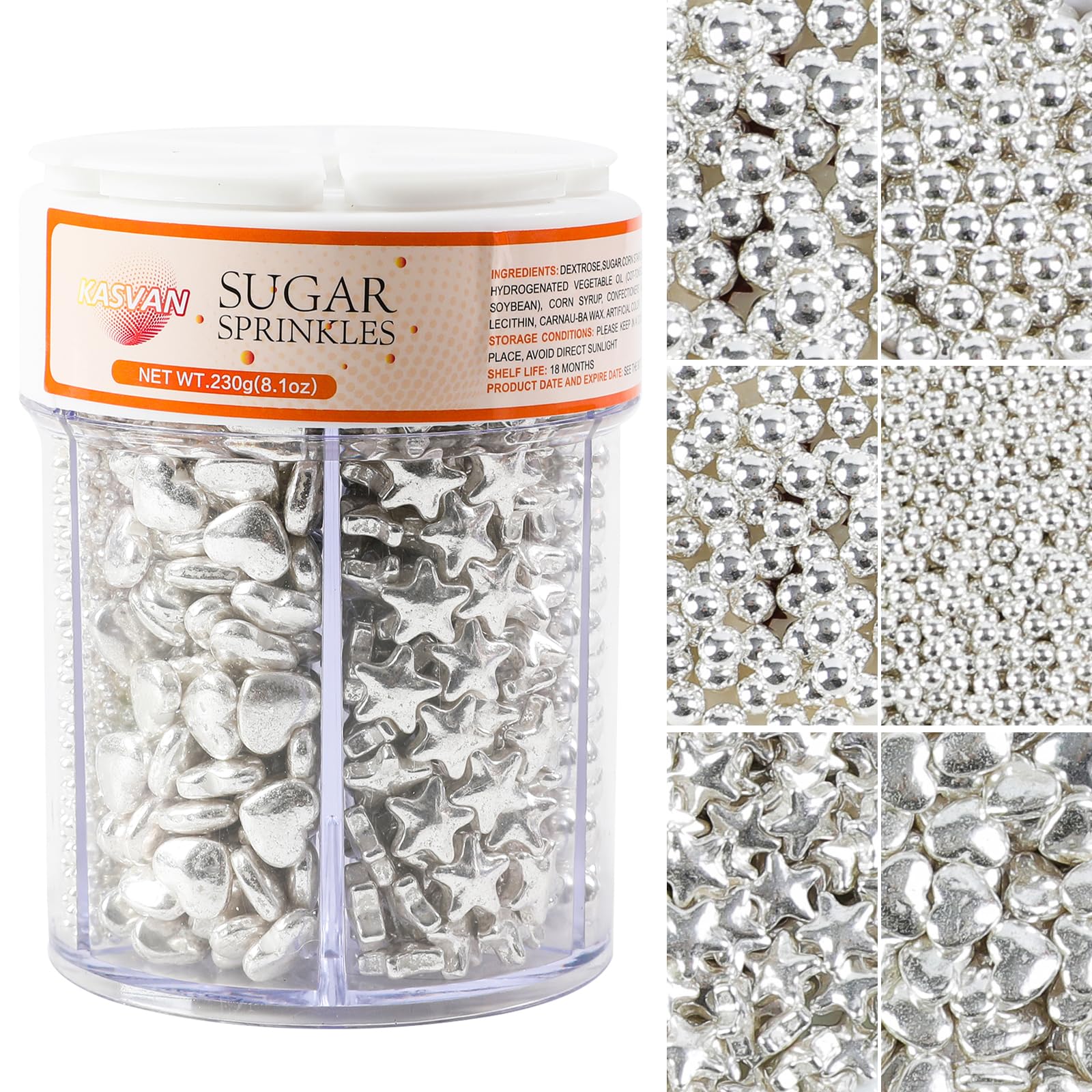 Kasvan Silver Pearl Sugar Sprinkles, 6 Sizes Mix for Cake Decorating, 230g/8.1oz, Ice Cream Toppings and Cookie Decorating, Wedding Party Chirstmas
