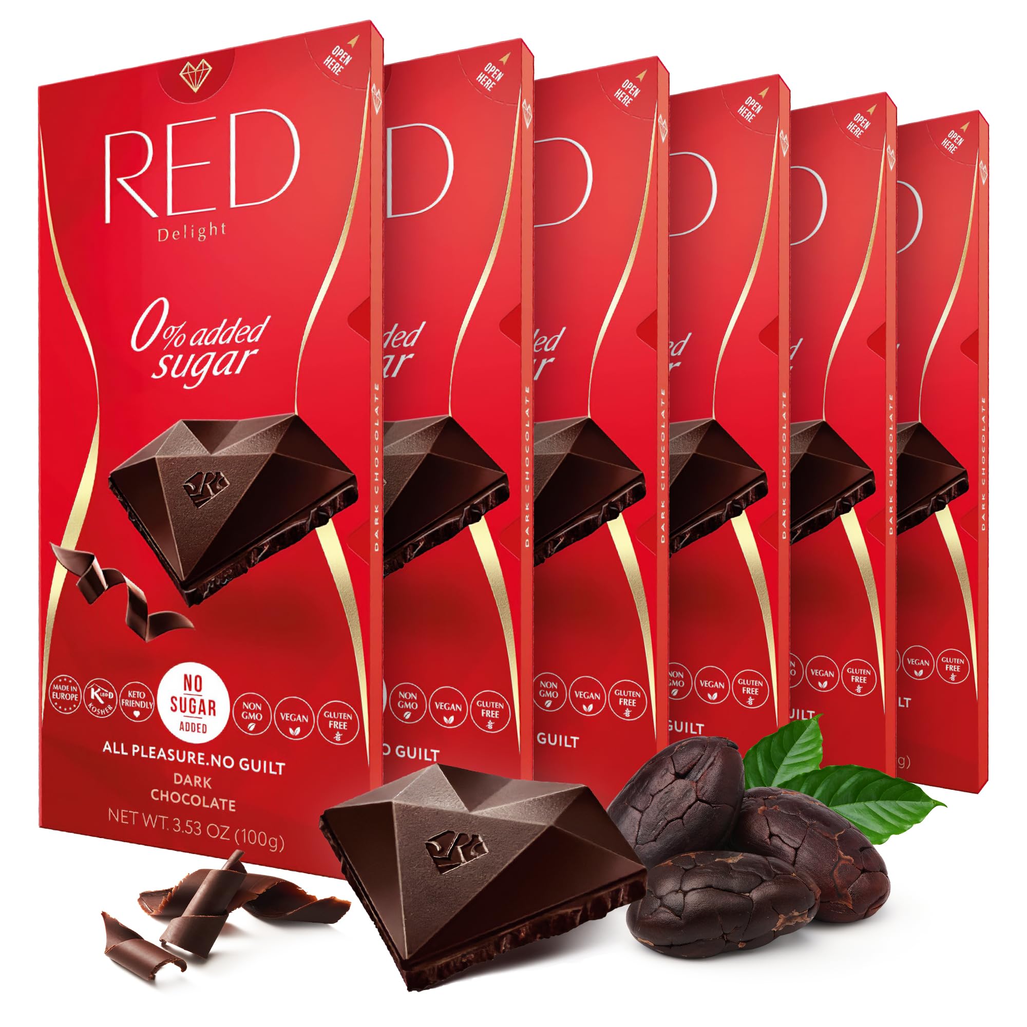 Red Delight Dark Chocolate Bars - 3.53 oz, Pack of 6 - Full-Size Keto-Friendly - Low Carb, Kosher, Gluten-Free, No Added Sugar - Smooth, Creamy Vegan