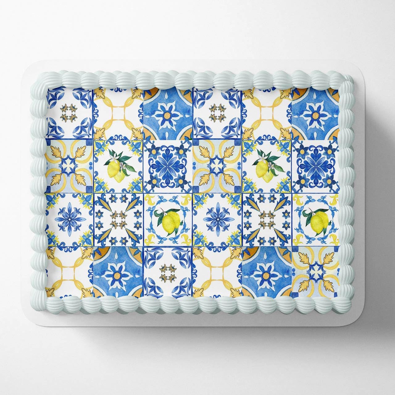 Mediterranean Mosaic Amalfi Lemon Inspired Tile Pattern Italian Tile Pattern Blue and Yellow theme Edible Cake Image Topper Birthday Cake 1/4 Sheet