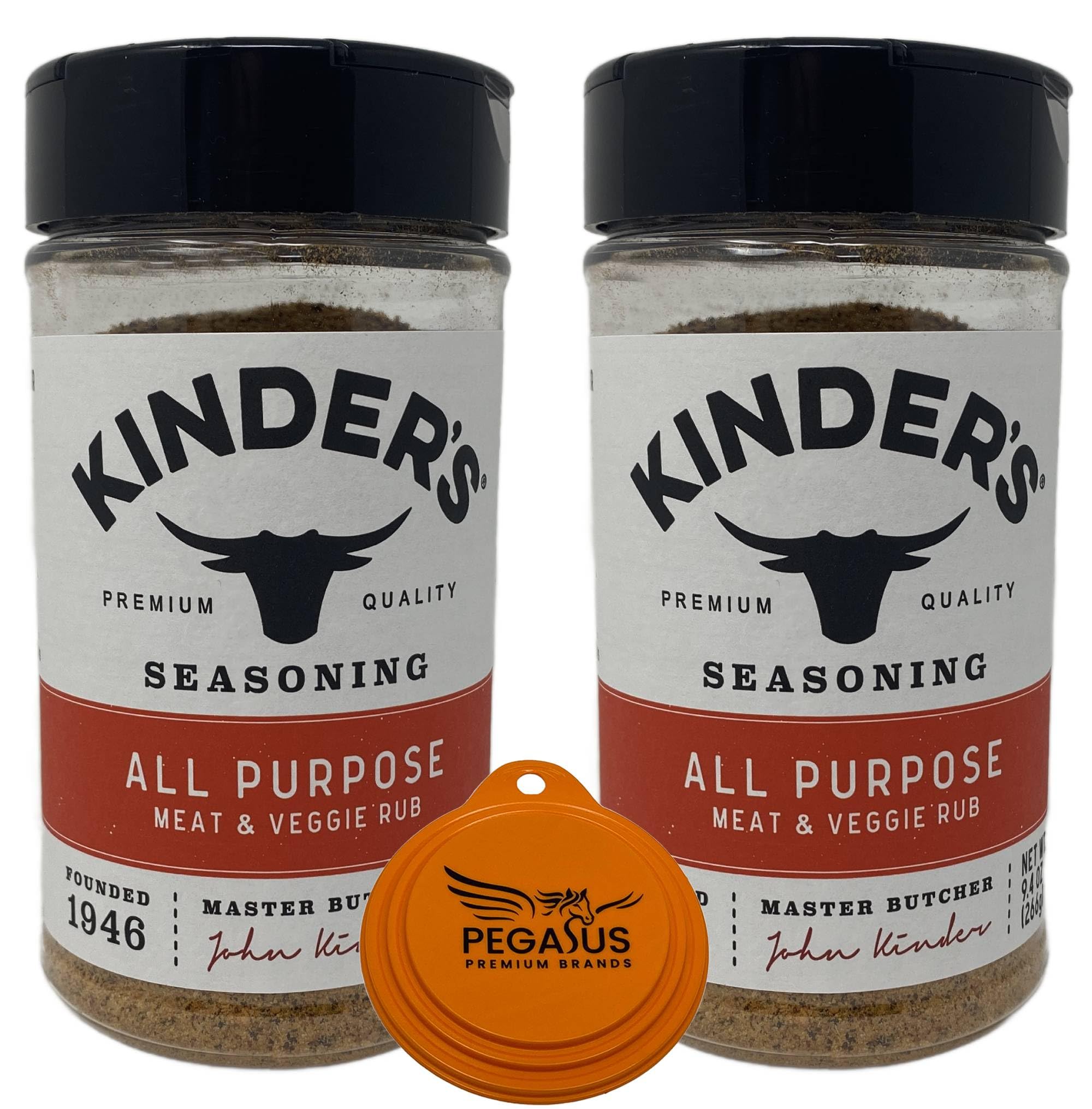 Premium Quality Seasoning Blend Set: Kinder's All Purpose Meat & Veggie Rub Seasoning 9.4oz (2-Pack) Variety pack also includes the Pegasus Premium Brands 3-Step Lid Cover reseals most common food cans from 3 ounce to larger. The 3-Step lid is dishwasher safe and has a convenient pull tab for easy r