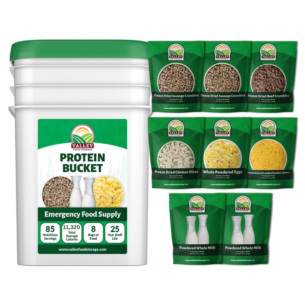85 Serving Premium Protein Bucket | Freeze Dried Meat & Dairy Contains 1,052g Protein | Non-GMO Emergency Food Supply 25 Year Shelf Life | Long Term