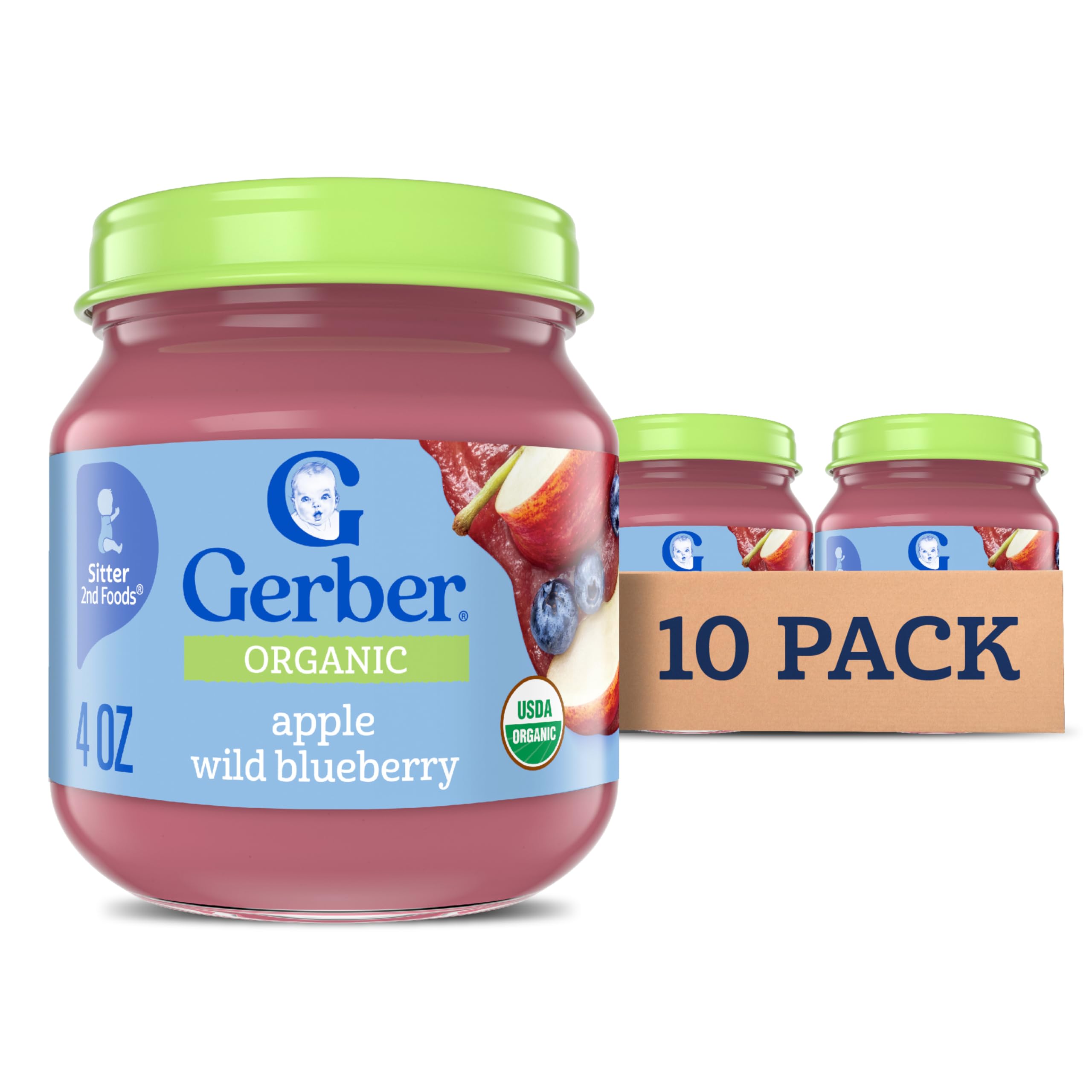 Gerber Stage 2 Baby Food, Organic Apple Wild Blueberry Jar, Fruit Puree, Vitamin C, Non-GMO, Baby Food Fruit, Puree Jars Glass, 10-pack