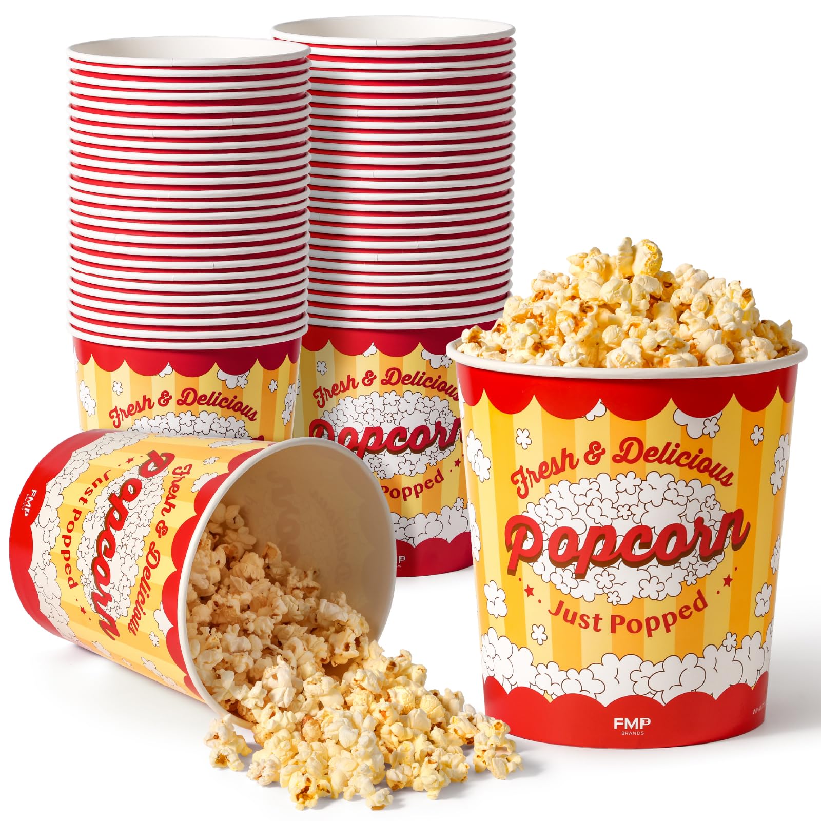 Fit Meal Prep 25 Pack Large Popcorn Buckets Disposable, 130 Oz Yellow and Red Paper Popcorn Containers Tubs for Home and Theater Movie Night