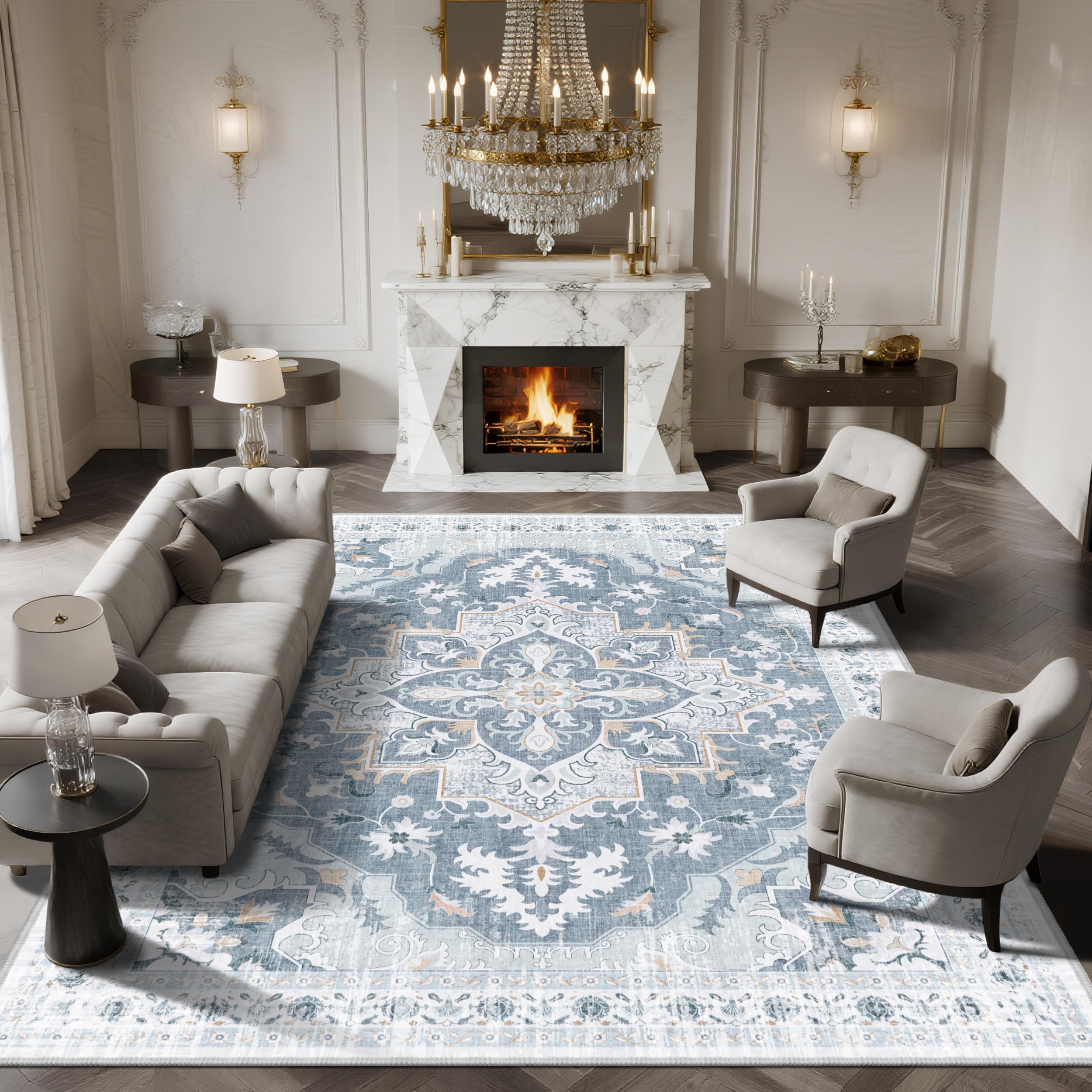 TTelephant Area Rugs 9x12 Living Room, Soft Non-Slip Vintage Medallion Rug, Low-Pile Printed Washable Area Rugs Blue Gray Rug for Living Room, Bedroom