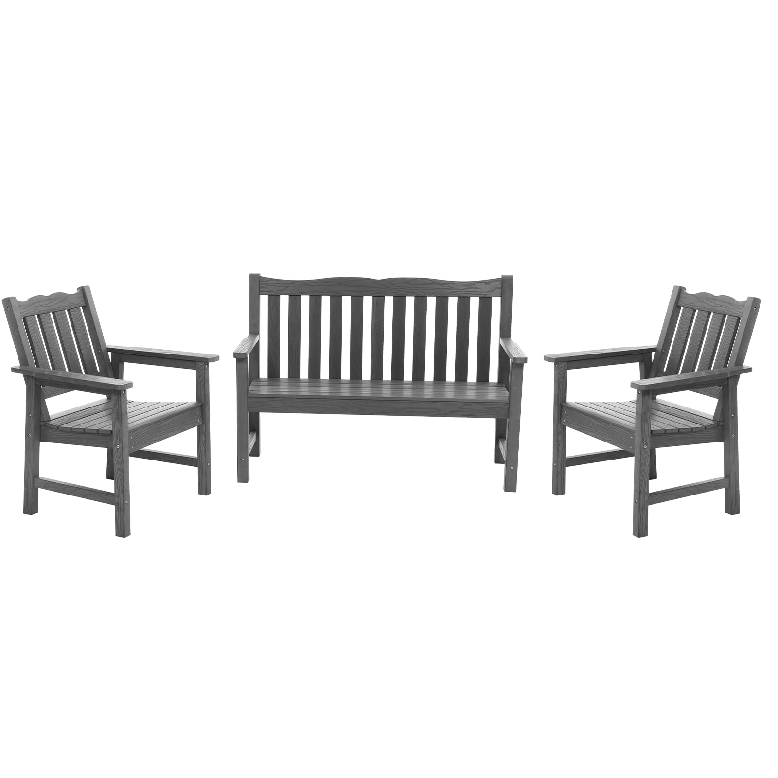 Stoog 3 Piece Outdoor Bench & Outdoor Chairs Set, All-Weather HIPS Patio Furniture Set, Include 1 Patio Bench and 2 Patio Chairs, Grey