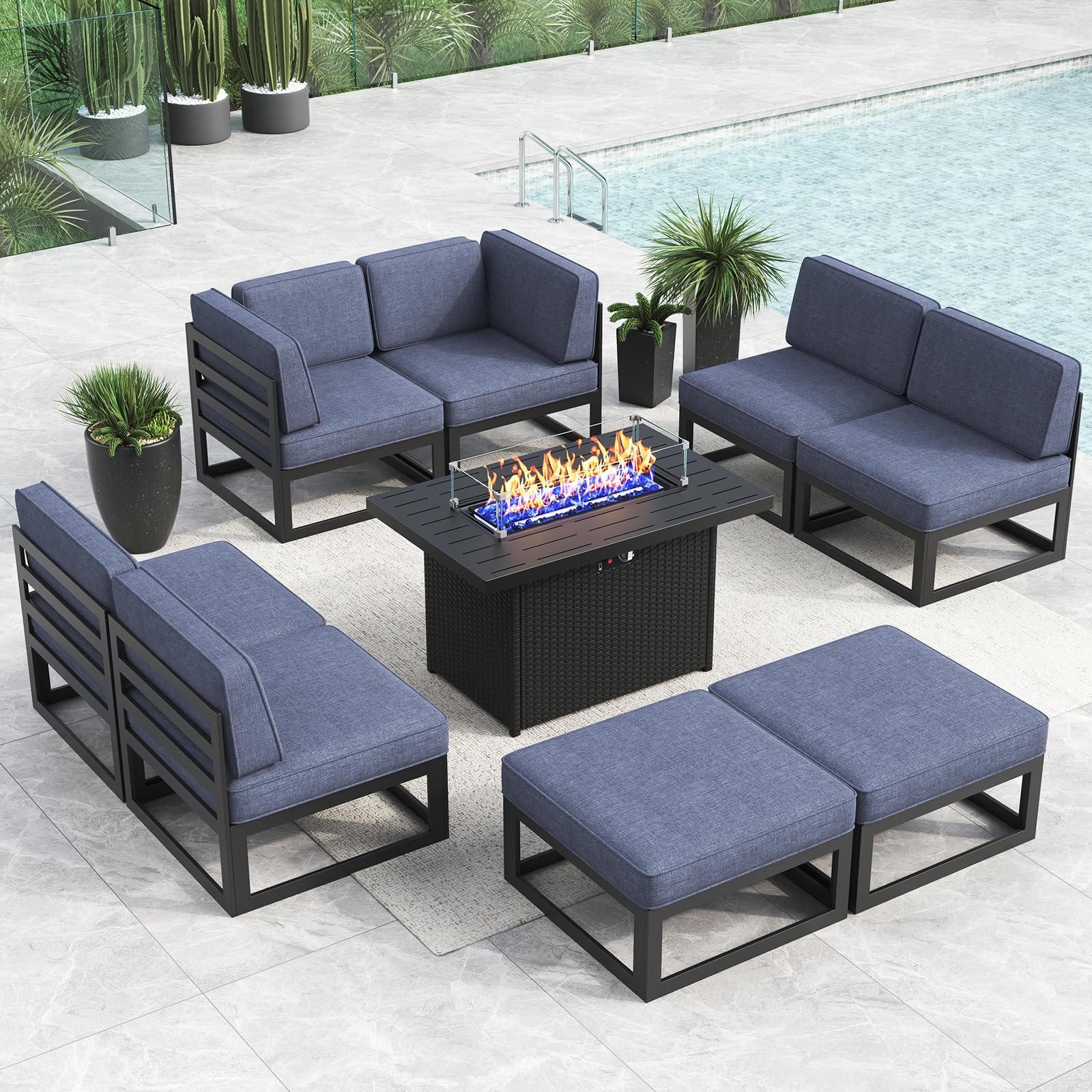 LayinSun Large Aluminum Patio Furniture Set with Fire Pit Table, 9 Pieces Modern Outdoor Conversation Set Sectional Metal Sofa Set with Olefin Cushion