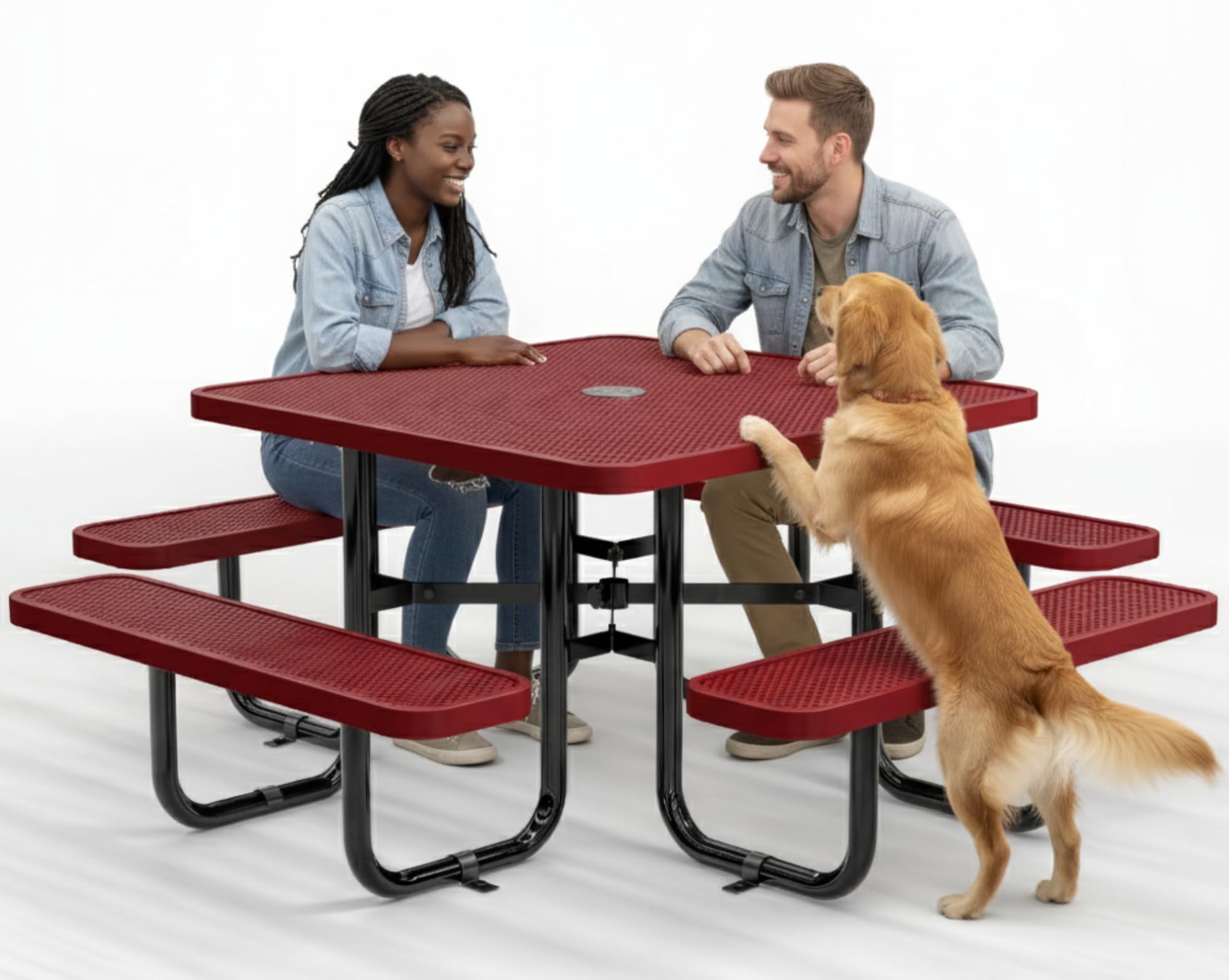 OUTTANS Metal Picnic Tables for Outdoors with Umbrella Hole - Coated Steel Heavy Duty Commercial Grade Furniture (Red, 46 in, Square, Punched Steel)