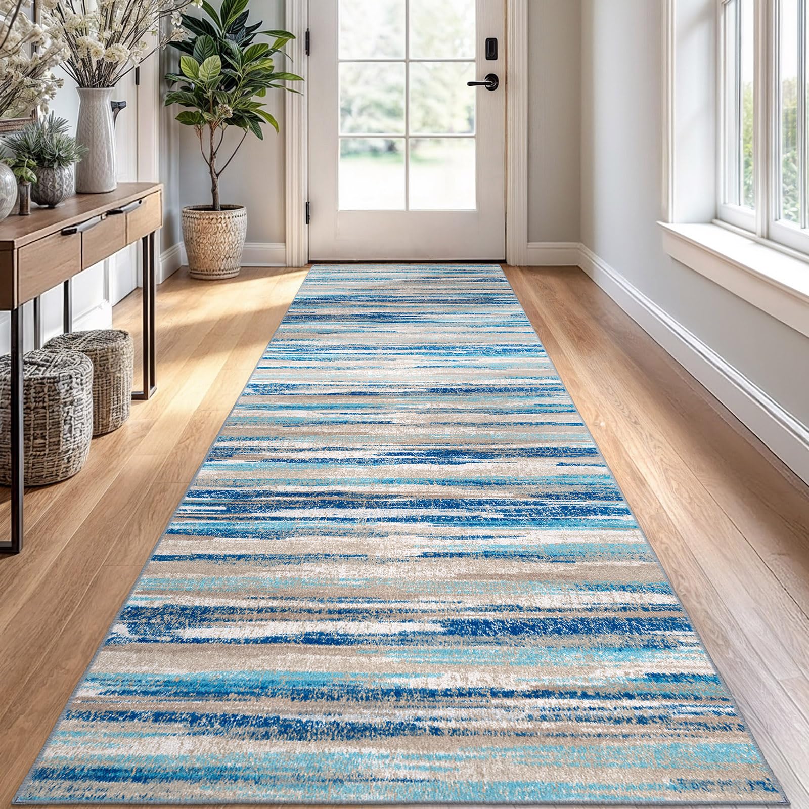 Lansny Modern Abstract Runner Rug 2.6x10, Blue Washable Long Kitchen Runner Non-Slip Soft Hallway Rug Runner Thin Print Faux Wool Carpet for Entryway