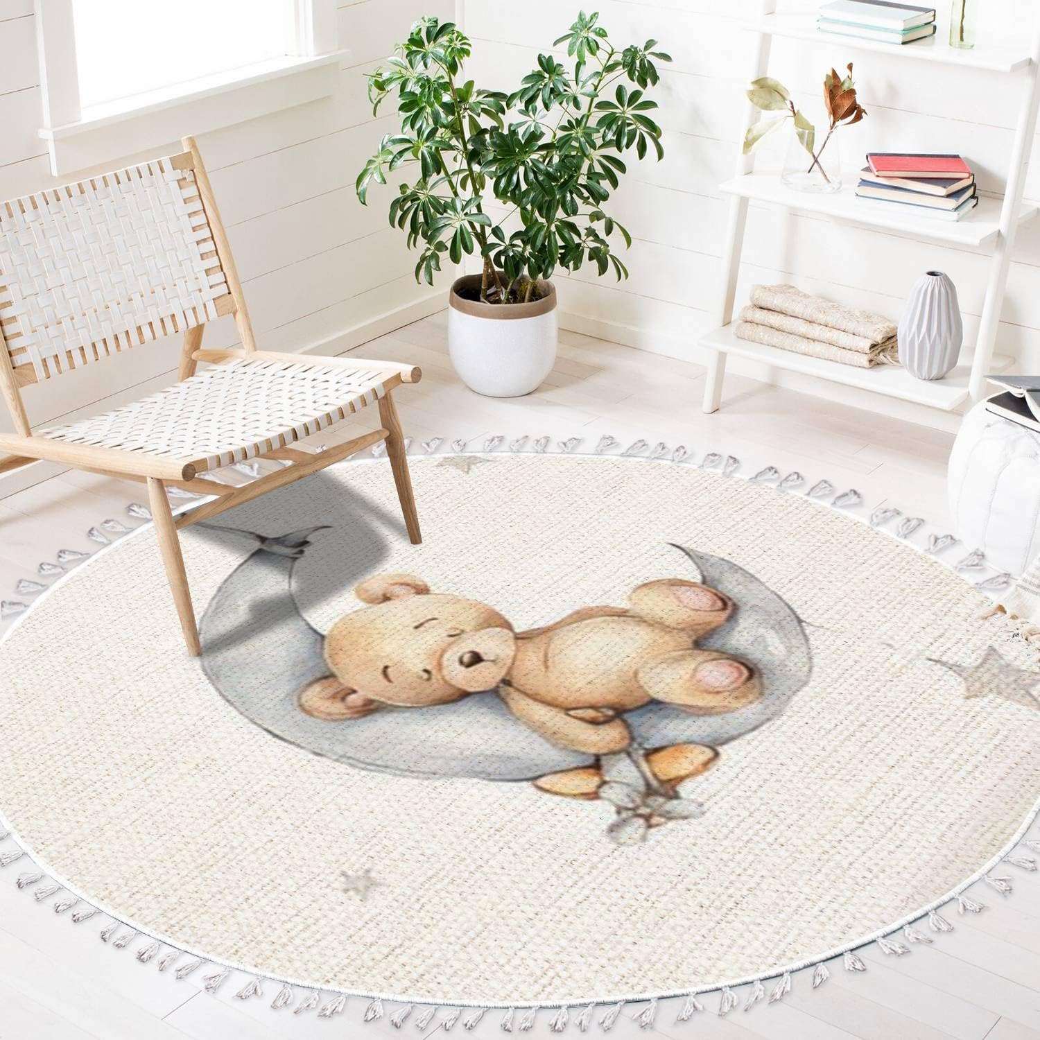 Round Boho Area Rug Watercolor Brown Bear boy Sleeping Moon Airplane Carpet with Tassels Meditation Rug Washable Hallway Floor Mat Runner Rugs for