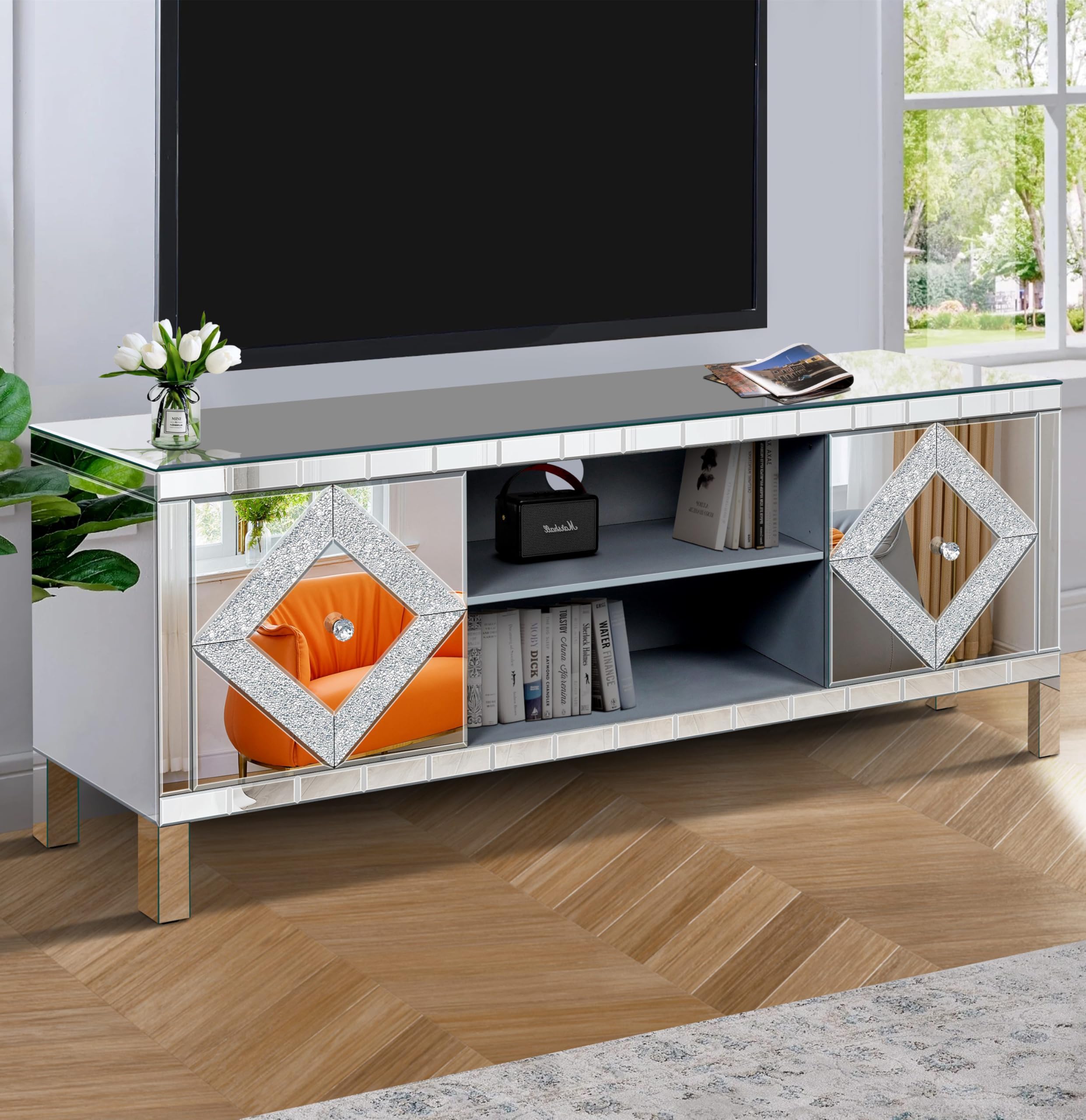 Mirrored TV Stand: Designed with a fascinating mirror finish, decorating with crushed diamond on both doors. It is perfect to support 65+ inch TV, which means the TV & media furniture game console cabinet is designed for your home decor,office,bedroom,living room Elegant & Luxurious: The Diamond-sha