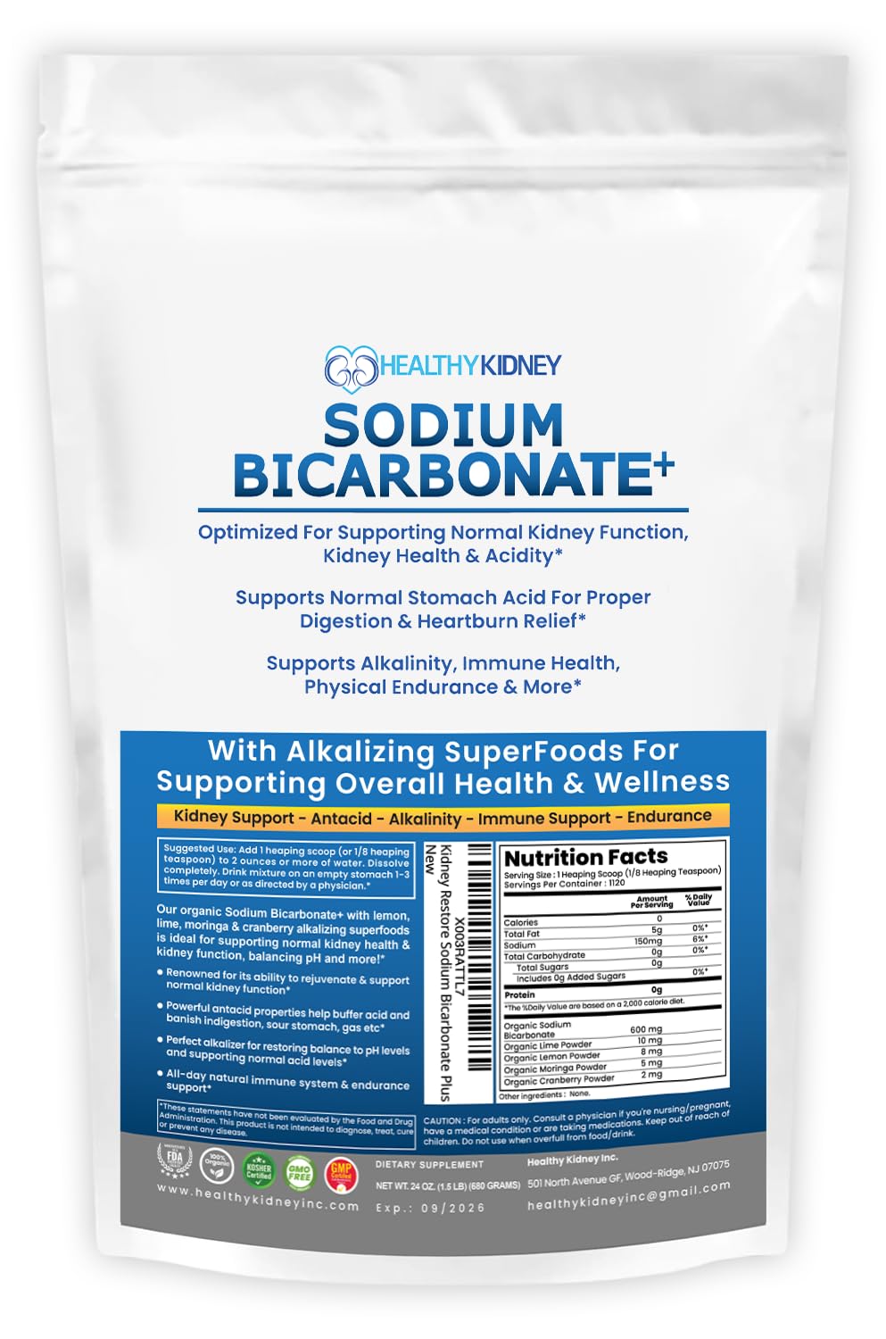 Our natural organic use Sodium Bicarbonate+ powder alkaline supplement with alkalizing superfoods designed to support normal kidney function & kidney health. Safe fast acting antacid for the stomach, an electrolyte which alkalizes & buffers acid for supporting immune health, sports performance & mor