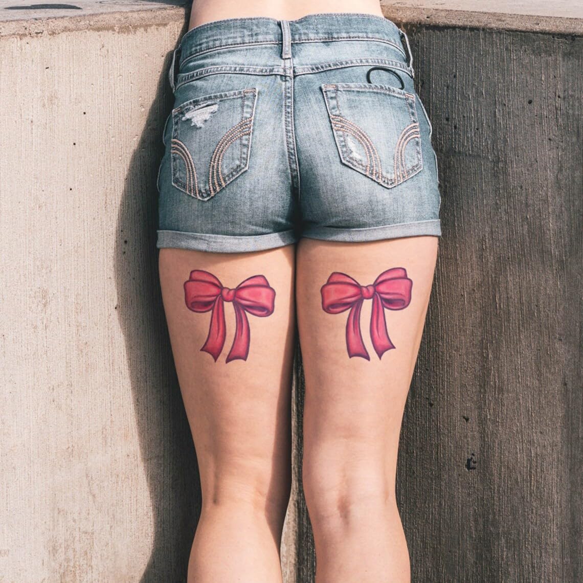 Seductive, beautiful Pink bowtie temporary tattoo Very realistic design! Comes in a set of 2 tattoos! Seductive, beautiful Pink bowtie temporary tattoo, looks sizzling hot on the back of the thighs! Very realistic design! Comes in a set of 2 tattoos! Size : 3.8" x 3.2" (approx)