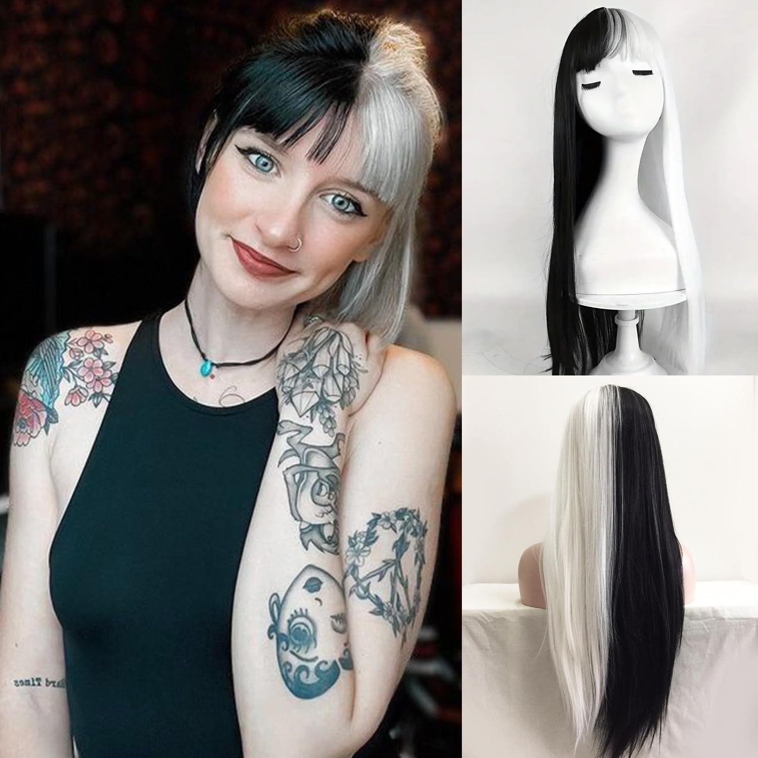 Civrie 28 inch Long Straight Black and White Cosplay Wig with Bangs Natural Hair Fiber Synthetic Wig for Women and Girls, Perfect for Halloween,