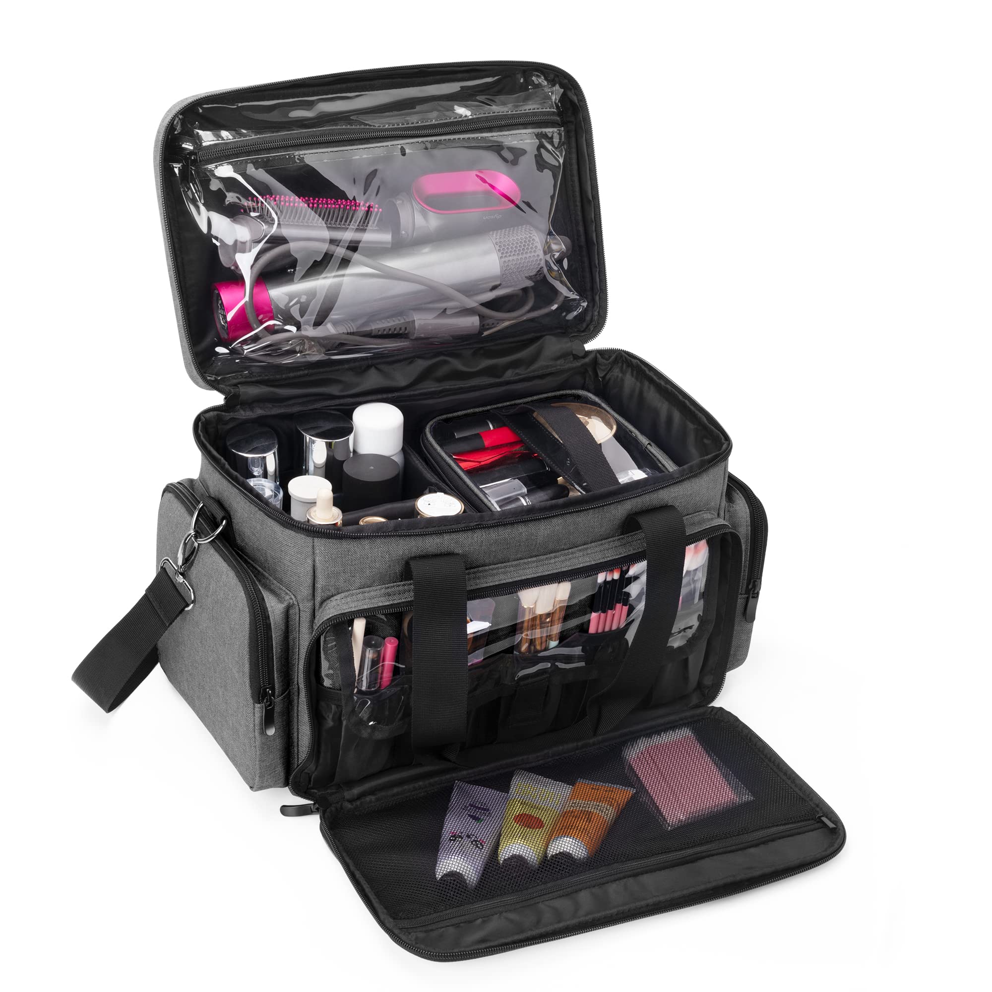 EXCELLENT QUALITY - Made of heavy duty nylon. Thick inner padding provides nice protection for makeup and hair supplies. FLEXIBLE MAIN SPACE - The main section with 2 detachable dividers holds a lot of cosmetics of all sizes. 2 additional removable transparent pouches to keep items in organized. The