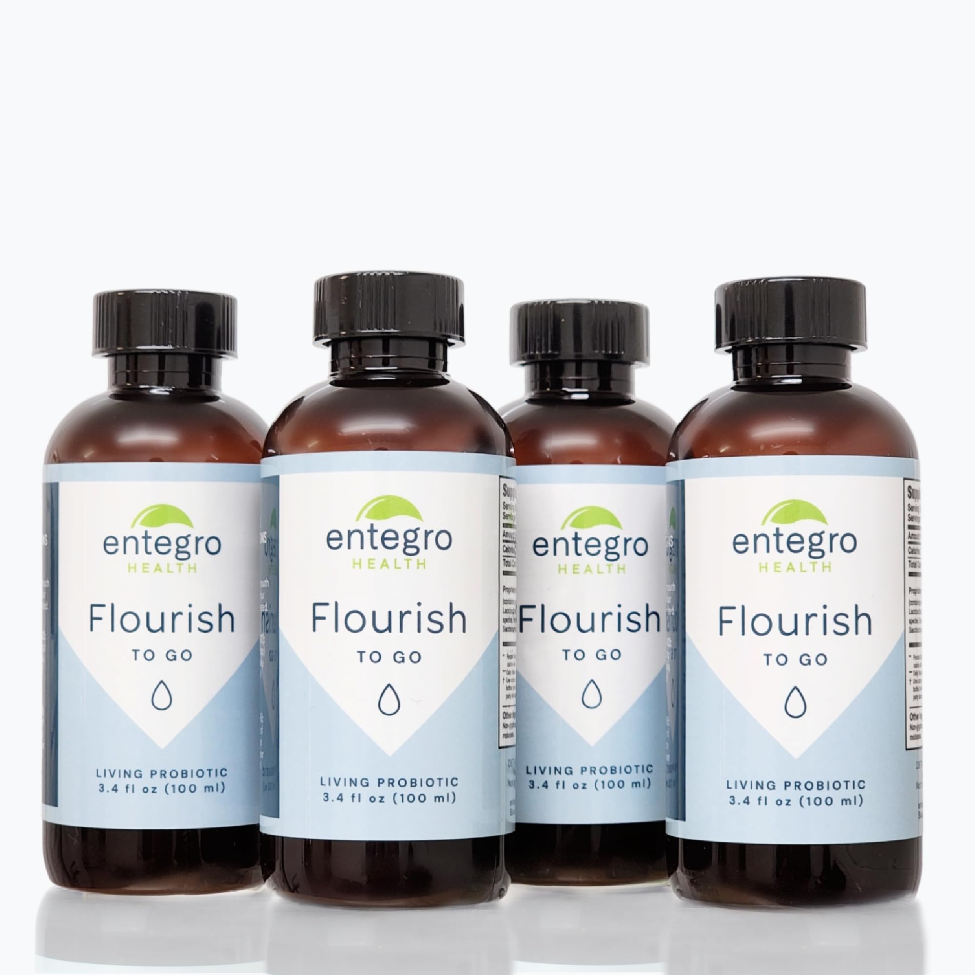ENTEGRO Flourish to Go Living Probiotic Supplement - 4 Pack Travel Bundle x 3.4 fl oz | with 11 Live Cultures | Gut & Digestive Health | for Women,