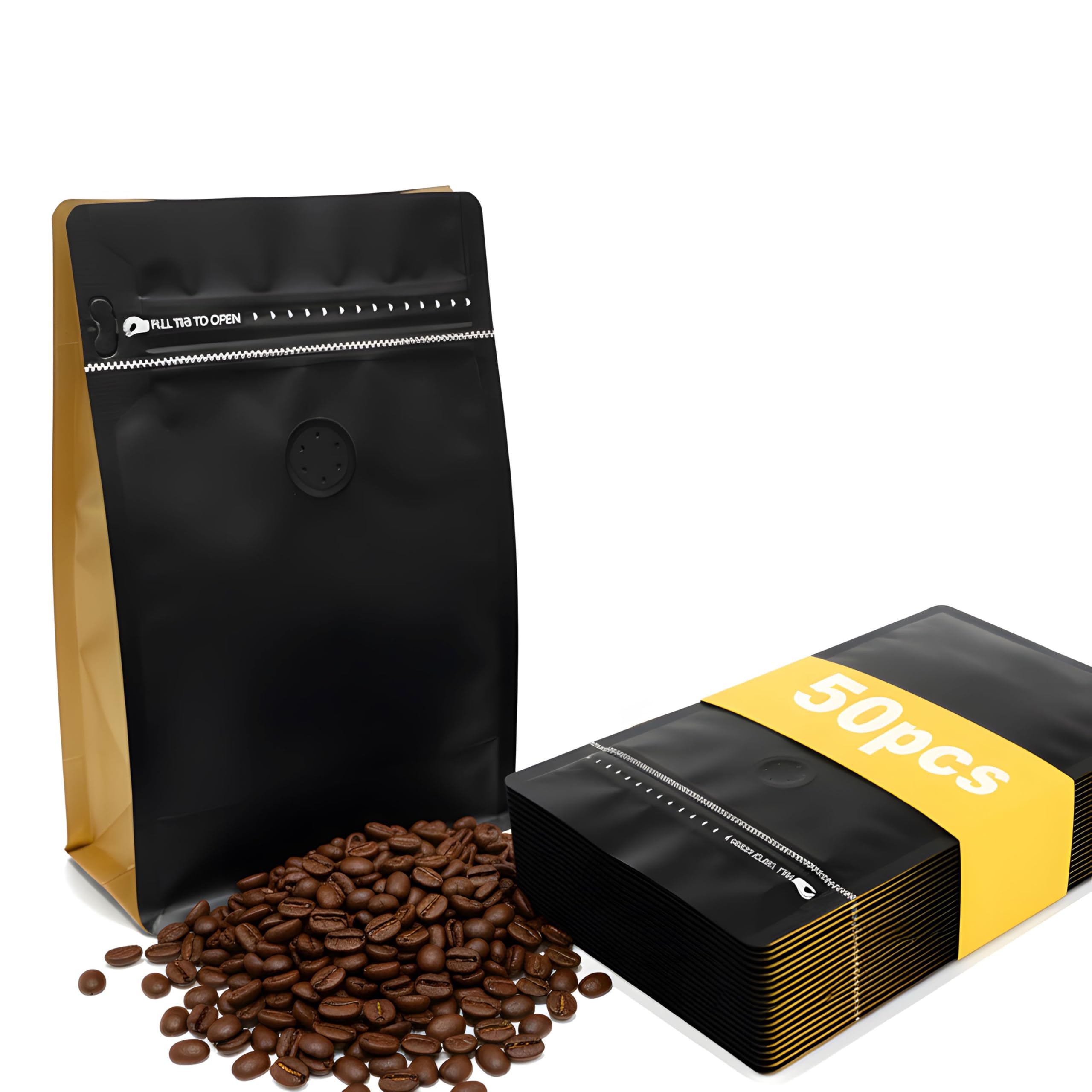 50 Pcs Coffee Bags With Valve Coffee Beans Bag with Heat Sealable Zipper Pouches and Valve Black Yellow Coffee Beans Home Storage Bags-16oz-1lb-