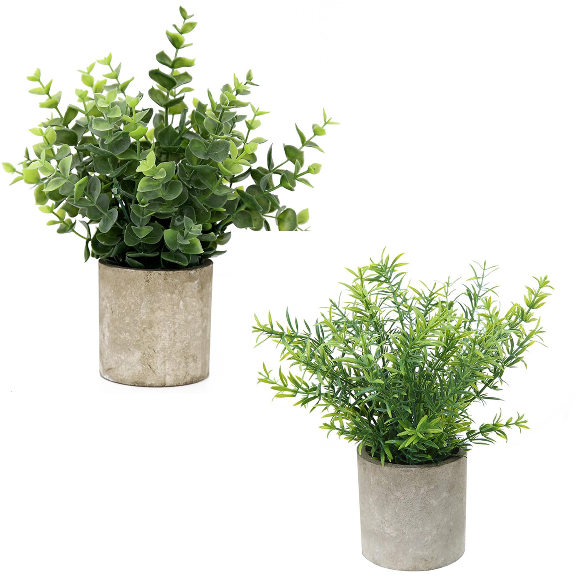 Small Potted Artificial Plants-Natural Look - Featuring dense clusters of plastic eucalyptus leaves and rosemary foliage, instilling color where it is missing, our Artificial Greenery Plant Set offers a great naturalistic look to your home. The package includes 2 potts, you can place them anywhere a