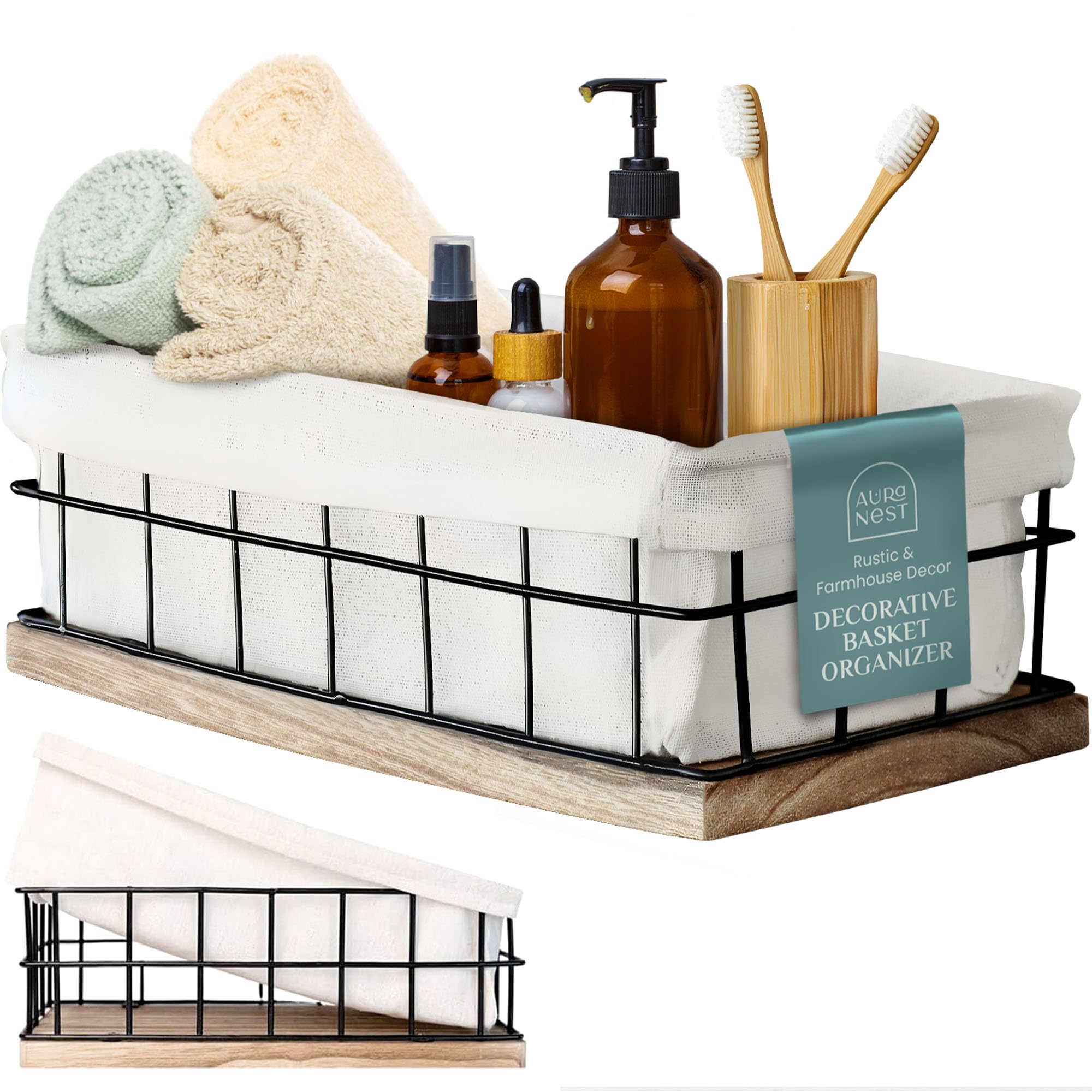 BEAUTIFUL AND FUNCTIONAL BATHROOM BASKET - This decorative basket for home decor combines a rustic wood base, a black wire frame, and a washable liner, creating a stylish yet practical solution for your bathroom decor. Ideal for organizing bathroom essentials like towels, toiletries, or creams, this