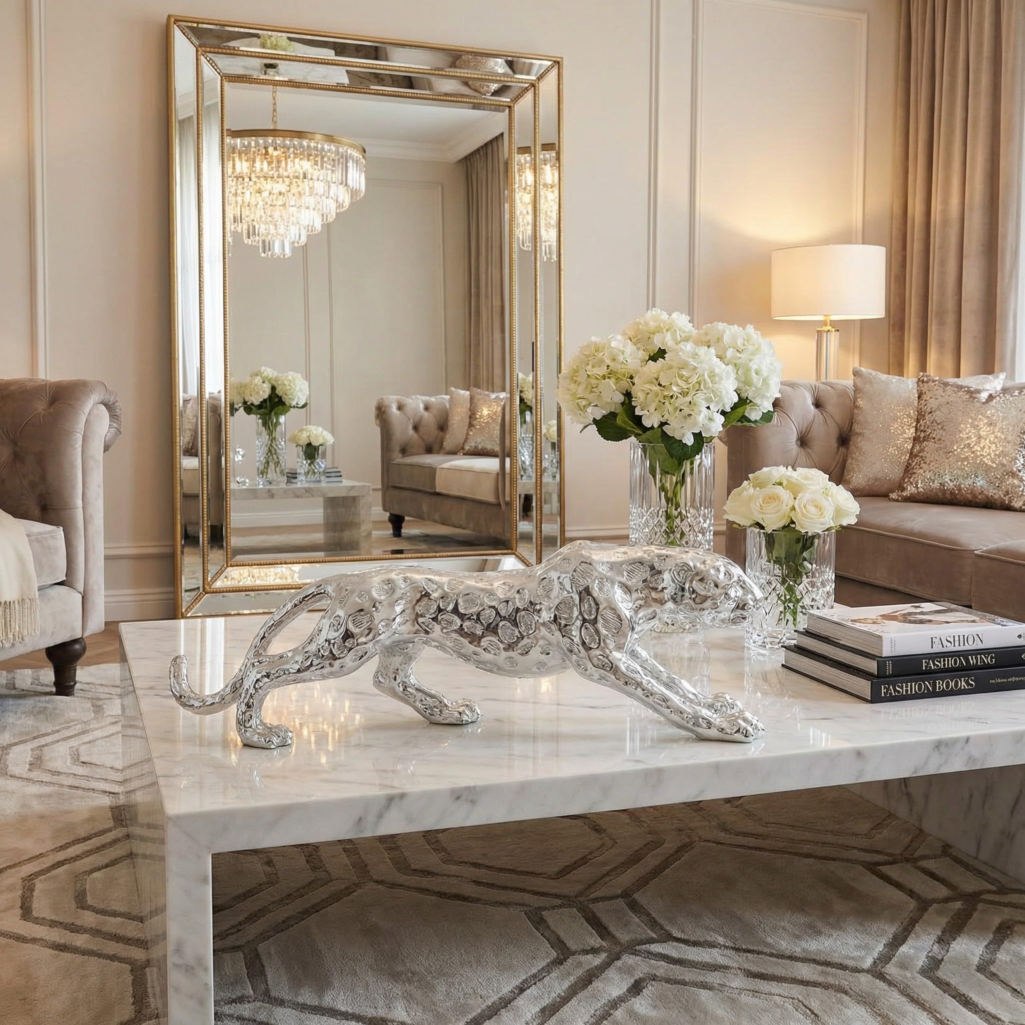 AFD Home Standing Gilt Leopard Statue, Prowling Pose, Hand-Cast Ceramic/Resin, 22 Inches Long, Silver