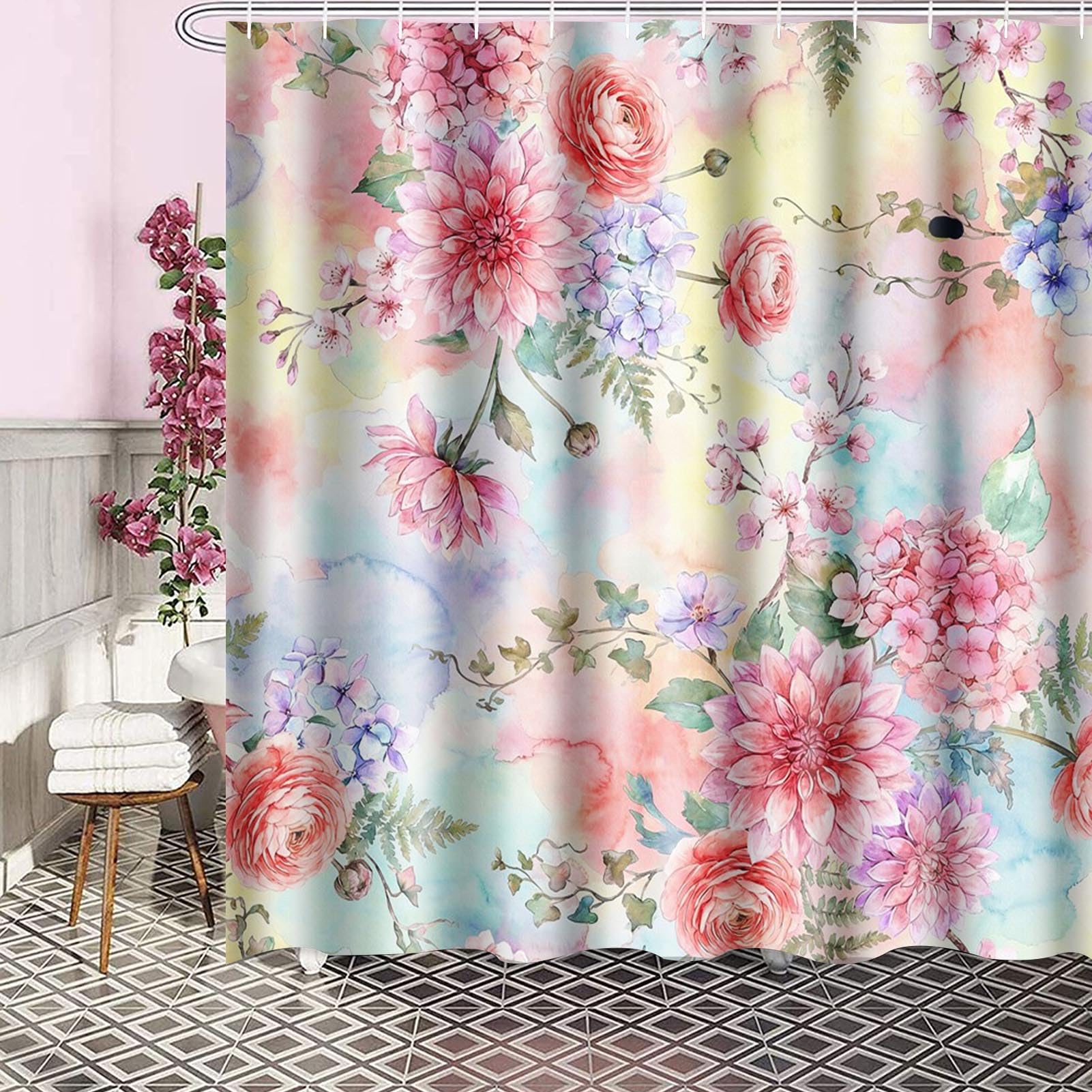 ArtSocket Shower Curtain Colorful Flowers Romantic Pink Teal Watercolor Chic Floral Pattern Home Bathroom Decor Polyester Fabric Waterproof 72 x 72