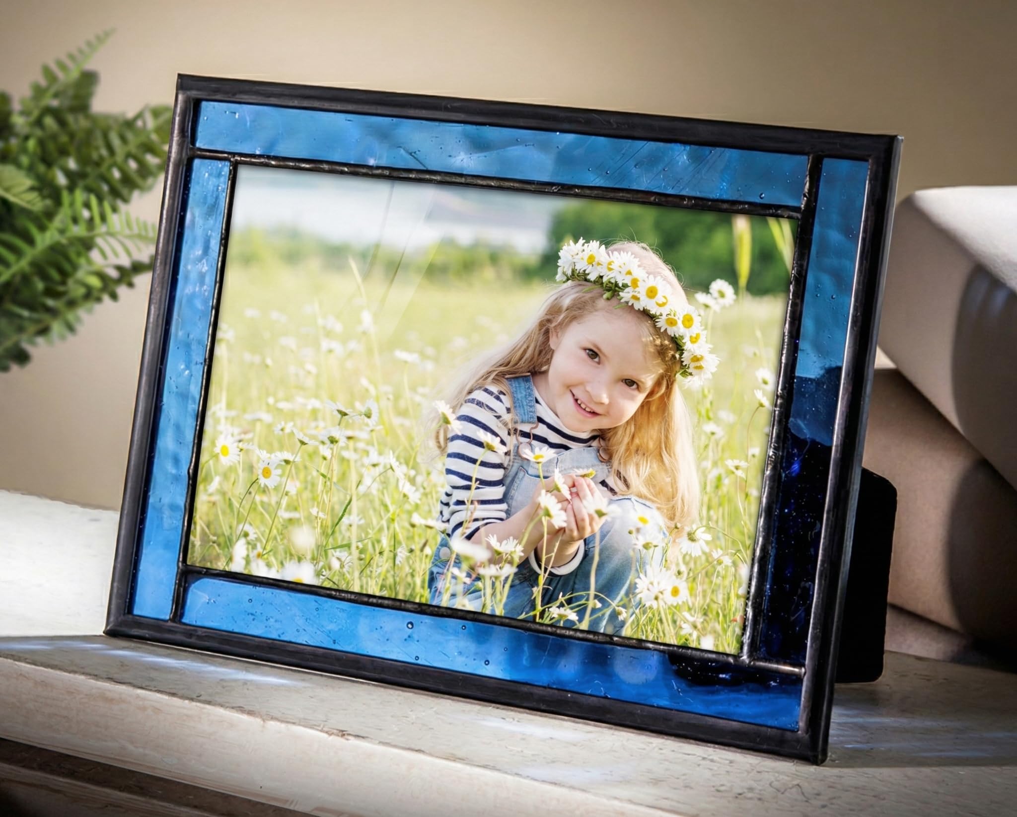 Blue Picture Frame Stained Glass Easel Back 4x6 Photo Display Horizontal Vertical Home Decor Graduation Gift for Women or Men Family Vacation Pic 324-