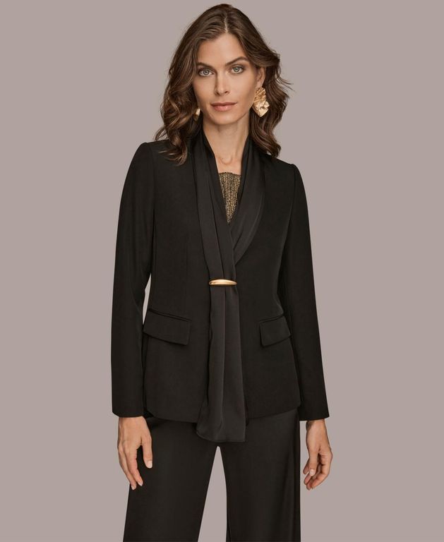 Women's Donna Karan Mixed Media Collarless Jacket - Black - Casual jackets Achieve effortless polish with this Donna Karan New York collarless jacket. A chic take on the classic tuxedo blazer, featuring satin scarf detail and bold metallic hardware....