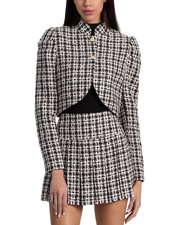 Women's Alice + Olivia Ilaria Cropped Tweed Jacket - Black - Casual jackets Intricately woven from metallic tweed, the "Ilaria" jacket by Alice + Olivia features a classic plaid pattern & nbsp; Mock neckline; button front Puffed shoulders Long...