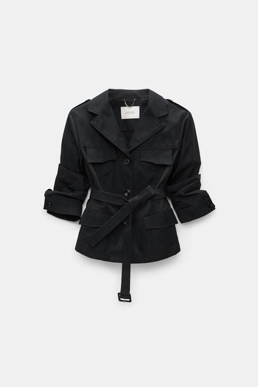 Women's Dorothee Schumacher Trench Coat-Blazer Hybrid - Black - Formal jackets The trench coat-blazer hybrid has bracelet-length sleeves and a slim tailored fit. The jacket features classic trench coat details and a belted sash.