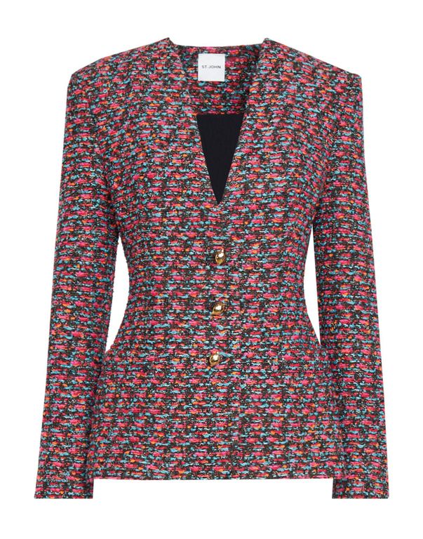 Women's St. John Blazer - Purple - Formal jackets Tweed, no appliqués, multicolor pattern, deep neckline, single-breasted , long sleeves, fully lined, button closing, multipockets, single-breasted jacket. 43% Synthetic fibers, 29% Wool, 28% Cotton.