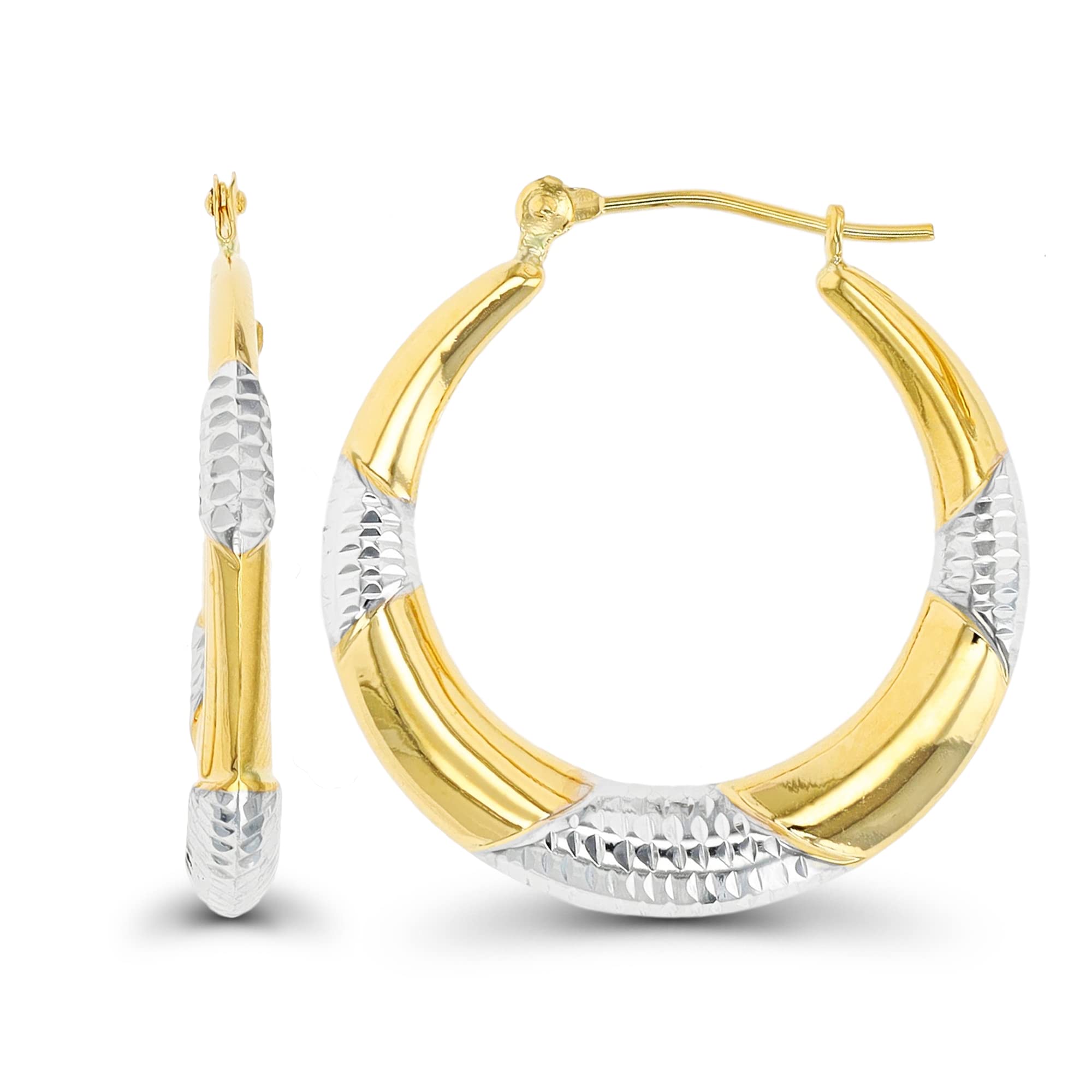 14K Two Tone Gold 4mm Thick Alternating Polished Diamond Cut Hoop Earrings with Hinged Clasp | 3mm-4x25mm Hoop | Earrings For Sensitive Ears | Solid