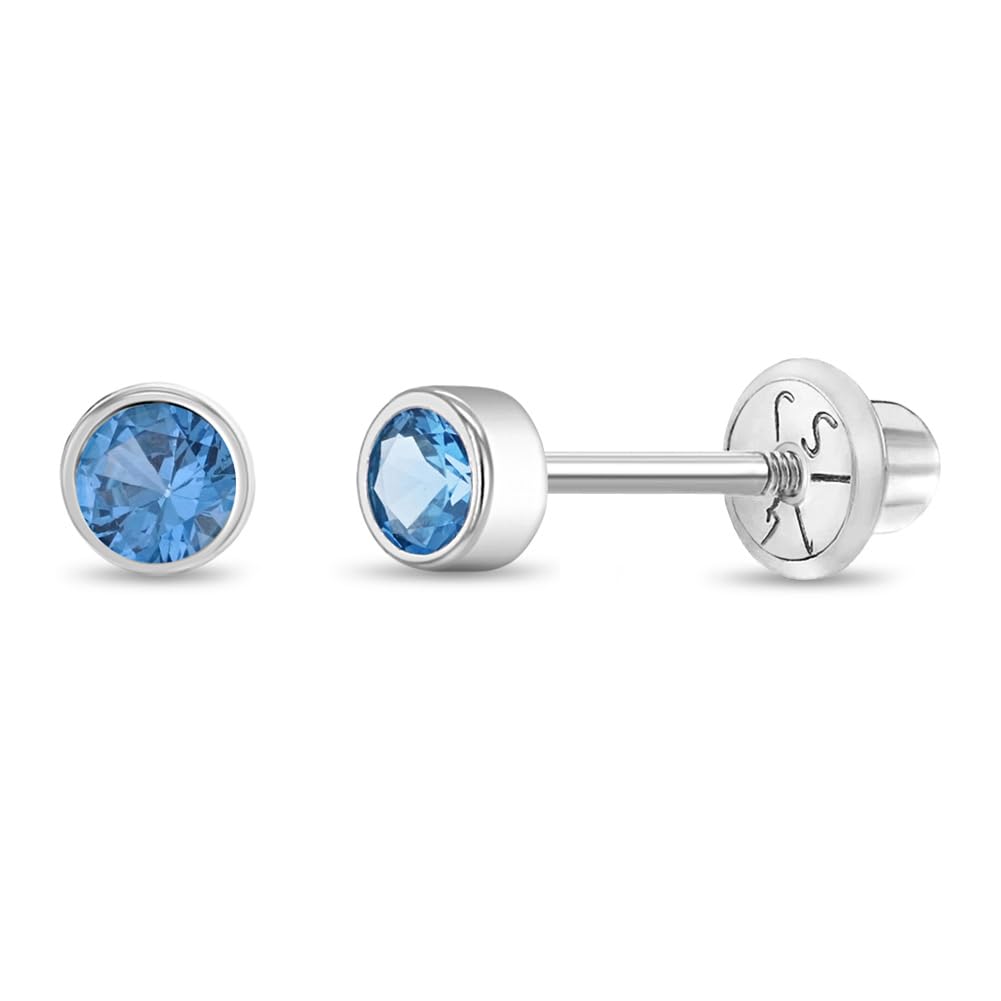 In Season Jewelry Bezel Simulated Birthstone Kids Earrings - 14k White Gold Earrings for Girls with Secure Screw Backs - Safe & Comfortable for Kids &