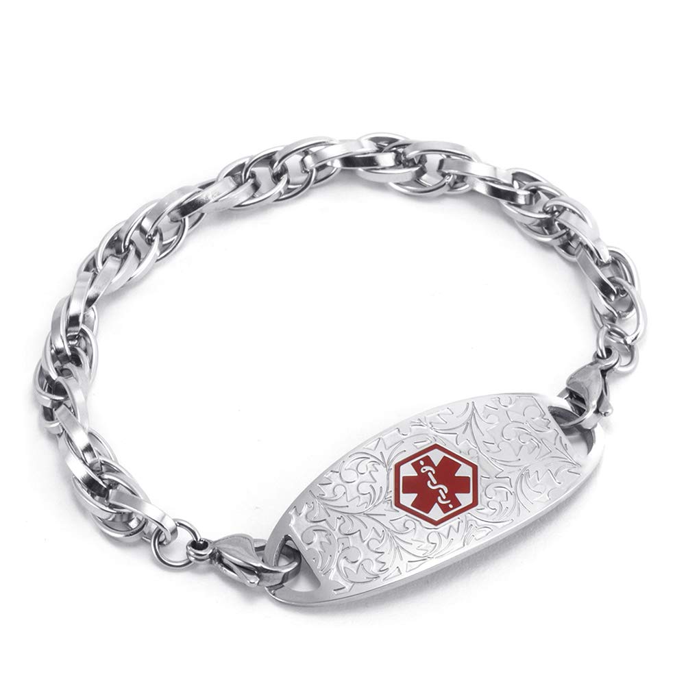 Personalized irregular flower pattern medical ID bracelet is stylish and elegant, made of high-quality stainless steel, waterproof, hypoallergenic and has good corrosion resistance and oxidation resistance, so it has a long service life. Custom engraved medical ID tag measures 1.7" x 0.7" x 1.6mm an