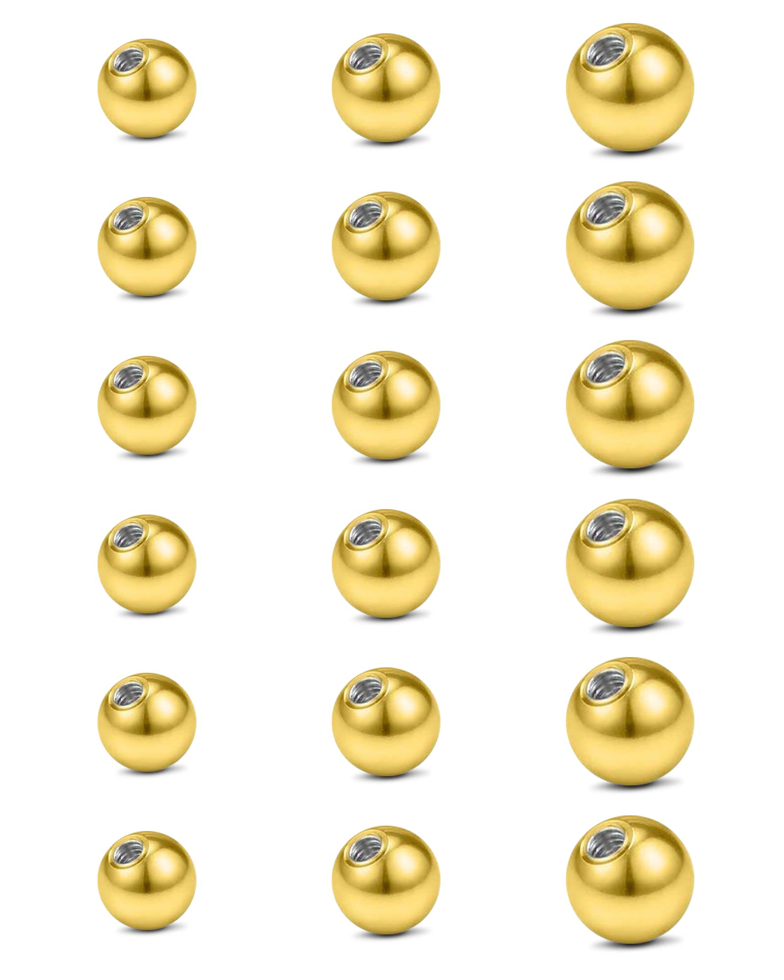 ❤ Package: 18Pcs Externally Threaded Stainless Steel Replacement Balls For Piercing Jewelry ❤ Size: Fit For 14 Gauge (1.6 MM) Externally Threaded Piercing Jewelry, Ball Size: 13/64"(5 MM),1/4"(6 MM), 5/16"(8 MM). Color: Gold Tone ❤ Material: Healthy Safe Surgical Stainless Steel. These Piercin