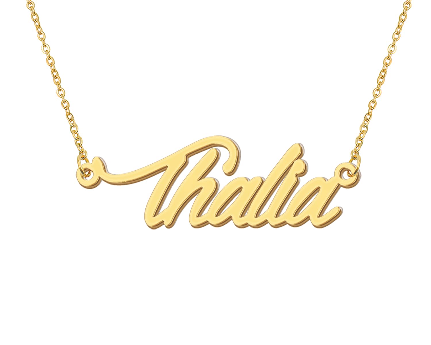 Thalia pendant nameplate necklace 18k gold plated stainless steel hypoallergenic, polished and no tarnish Dainty initial name plate necklaces about 38*11.5mm, 16" with 2" ajdustable chain Engraved name charm choker chain for women, mother, mom, mama, daughter, sister, wife, grandma, grandaughter, fa