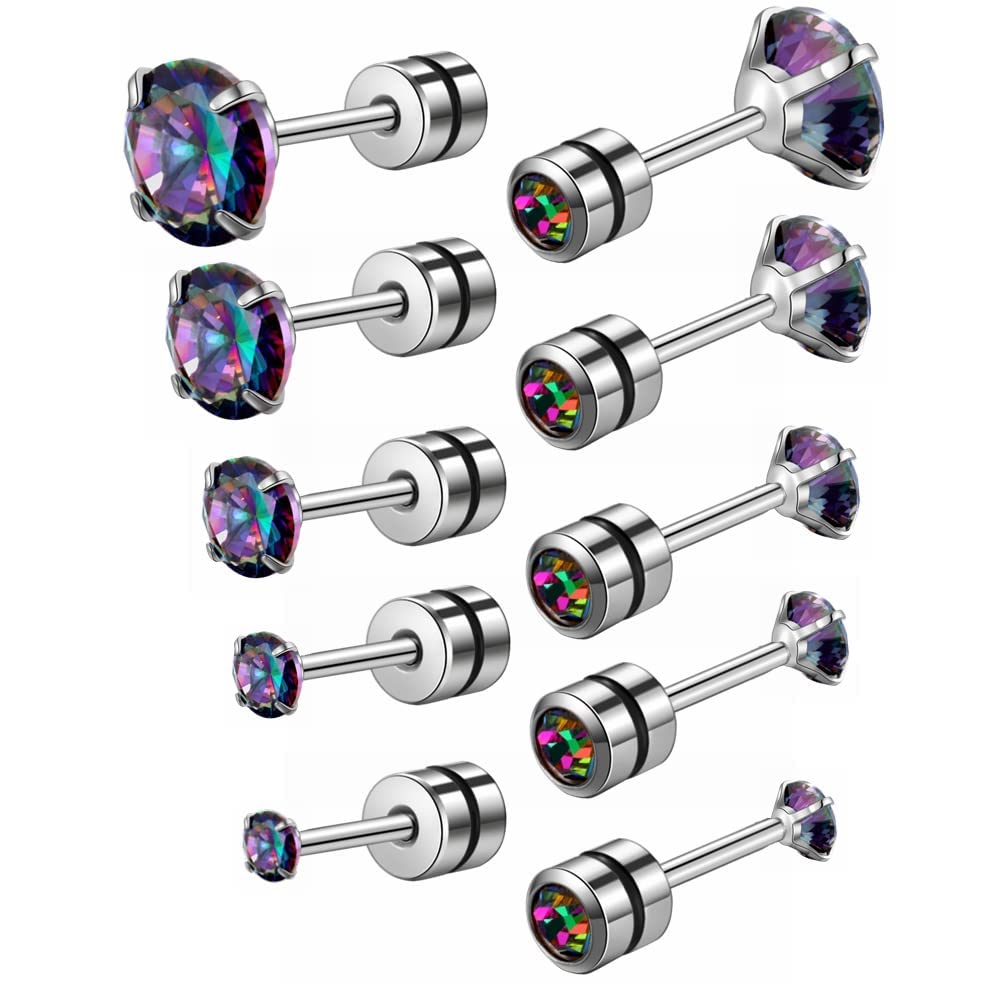 Screw Back Earrings: One pack contains 5 pairs of studs earrings, sliver round cz(black white blue rainbow) and black rainbow cubic zirconia earrings,different colors give you more choice.Screw flat back can wear double side.The back of the earrings is also inlaid with best cubic zirconia, you can a
