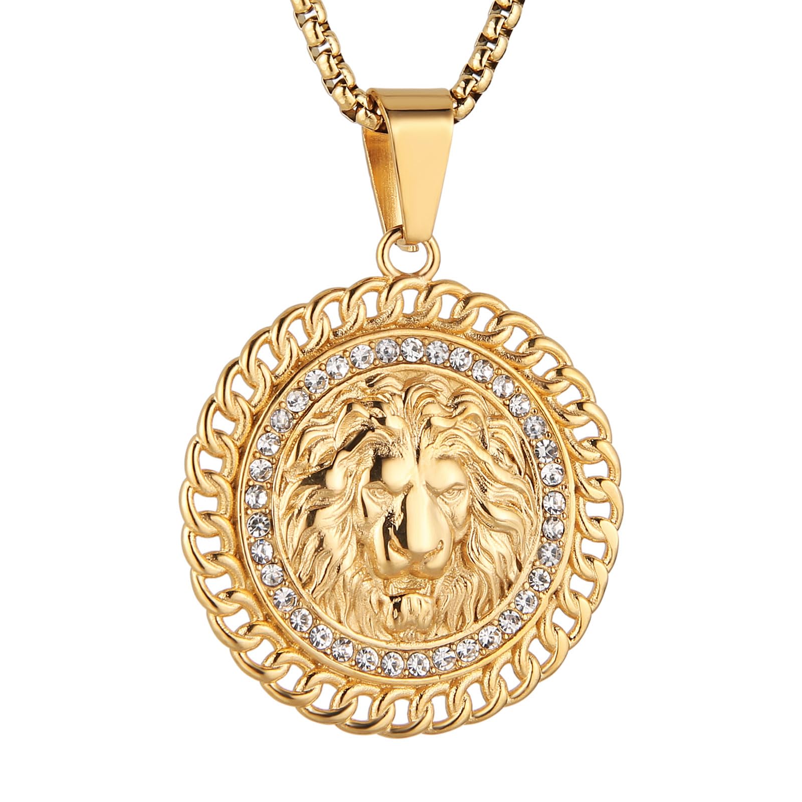 HZMAN 18K Gold Plated Lion Head Necklace Pendant for Men Stainless Steel Hip Hop Rock Lion King Necklaces Charm Animal Amulet Jewelry