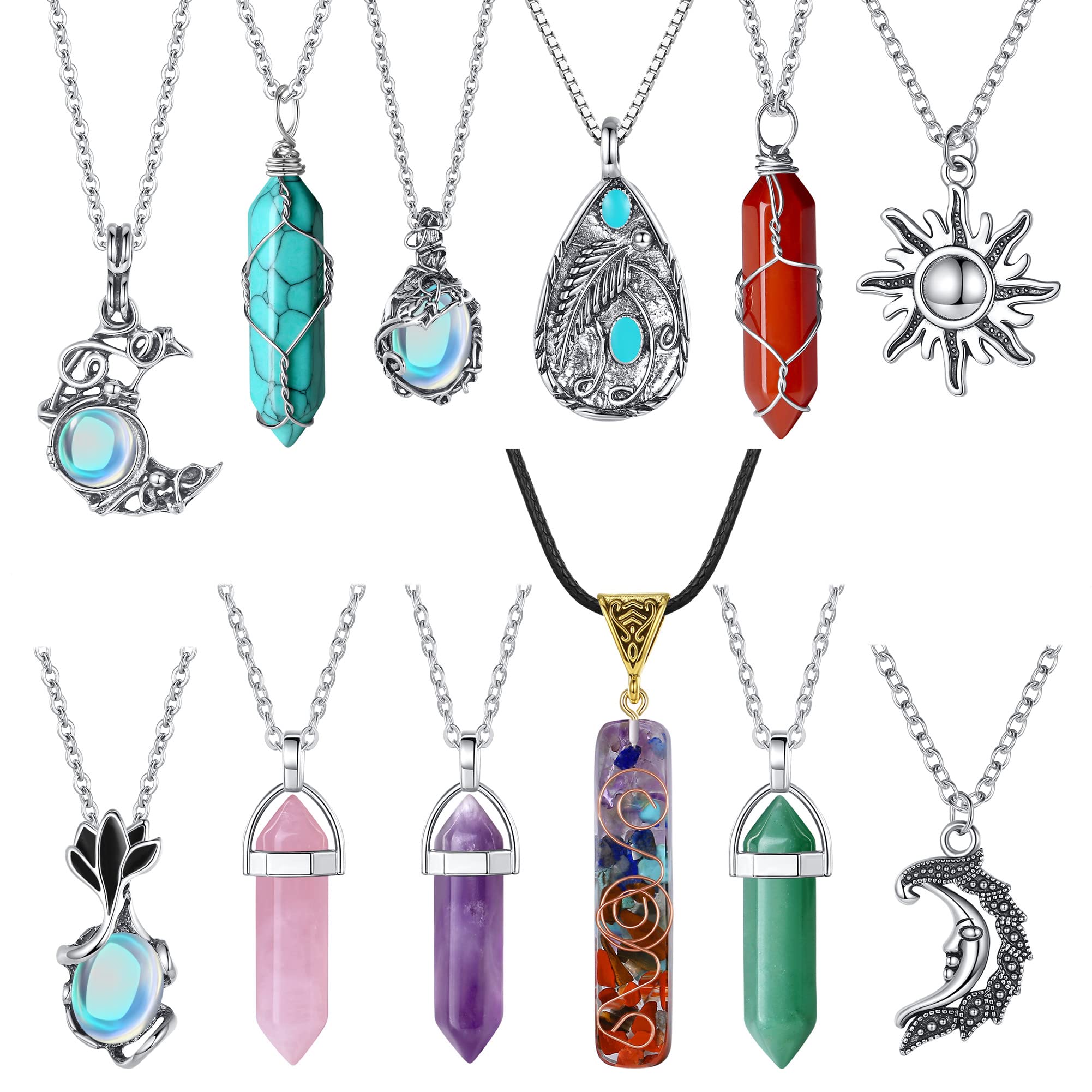 The 12-piece healing crystal necklace 7 chakra necklace, moonstone necklace, vintage sun moon necklace, amethyst necklace, rose quartz necklace, green turquoise necklace, carnelian necklace, green aventurine necklace. A variety of vintage style hippie boho fashion necklaces that are very beautiful y
